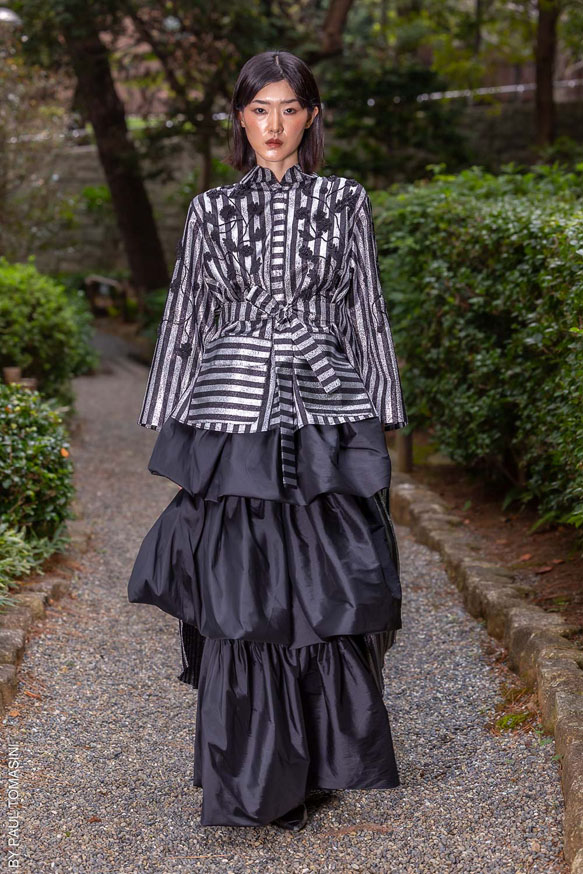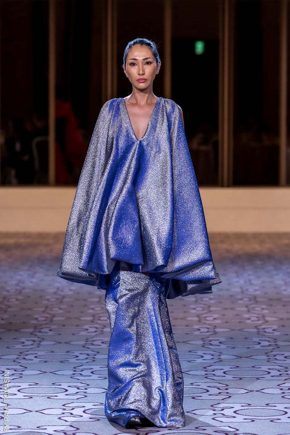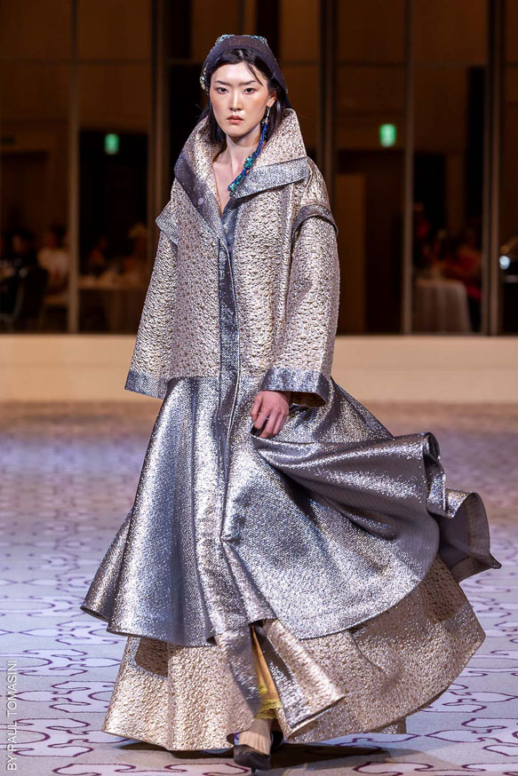 Nazym ARUNAZ presented a collection that merges Kazakh and Japanese culture with Japanese cuts and reminders of the ancestral culture of Kazakhstan.