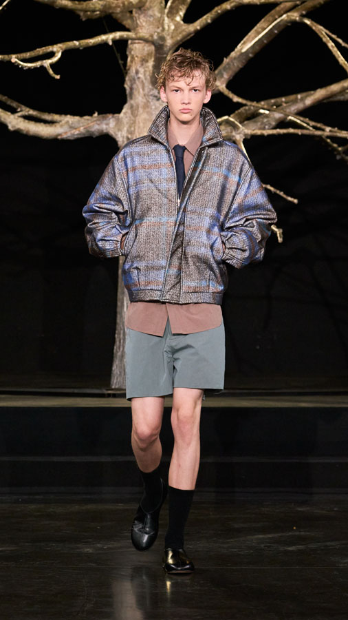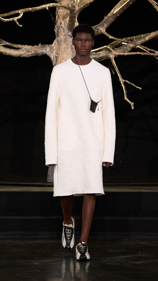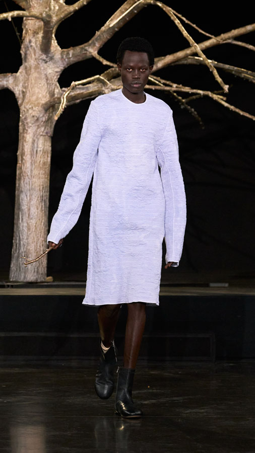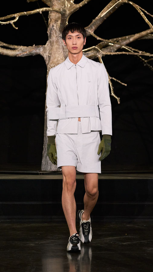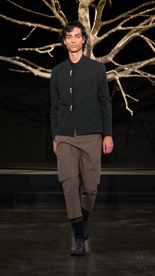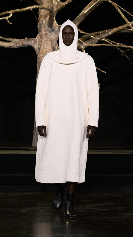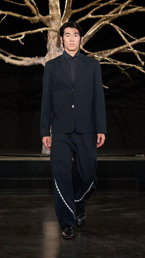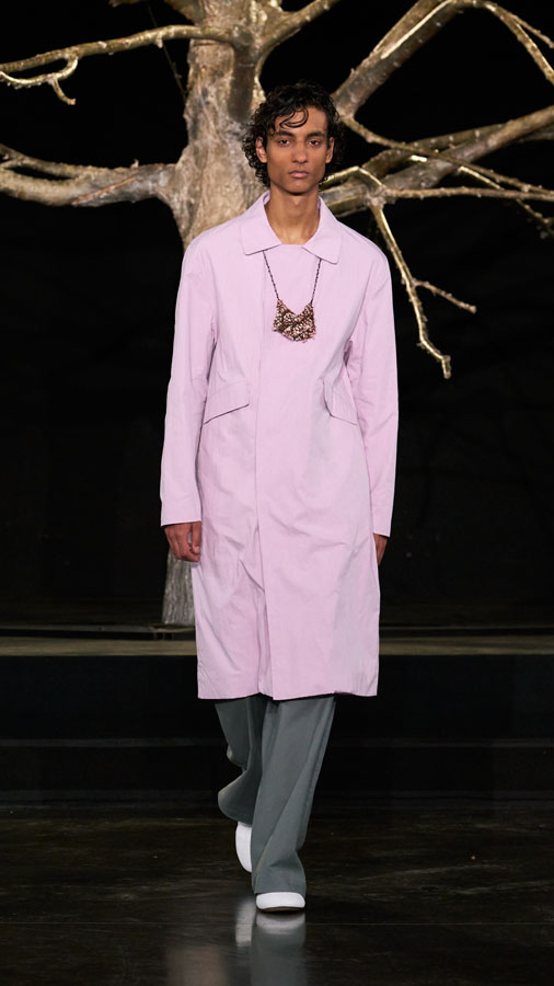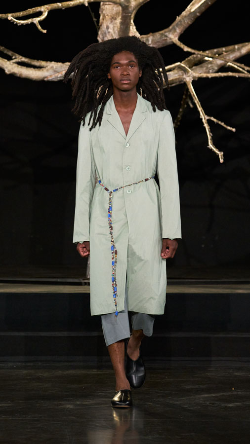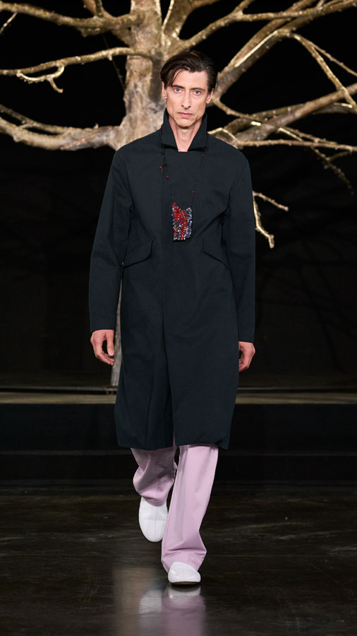 A major highlight of the collection is the use of smart textiles embedded with binary codes woven into the fabric, developed in partnership with Micheline Maia Teixeira from R-INOVE. These codes, visible under UV light and readable via QR code, store blockchain data about the production chain, offering full transparency and traceability — a testament to the brand’s commitment to conscious and sustainable fashion.