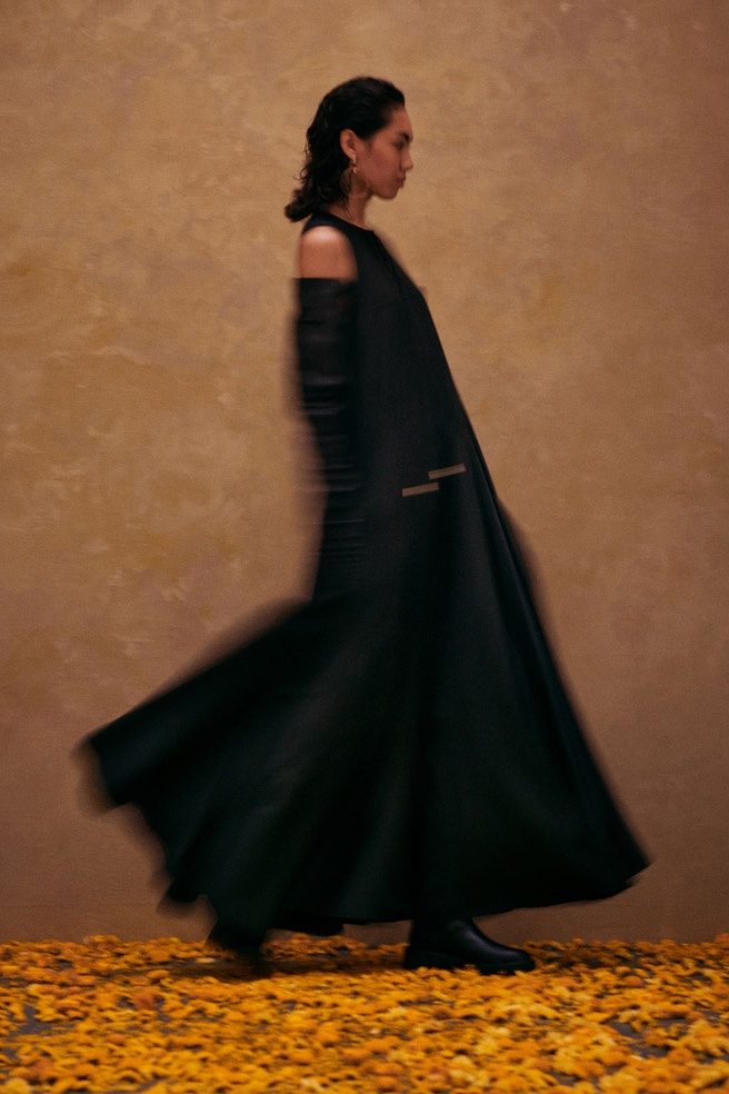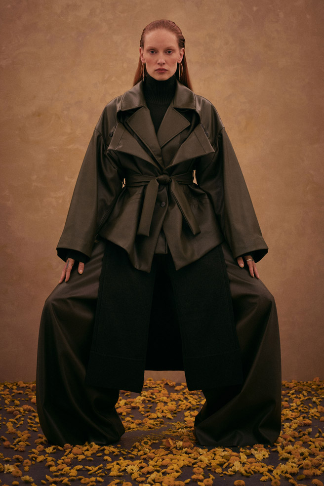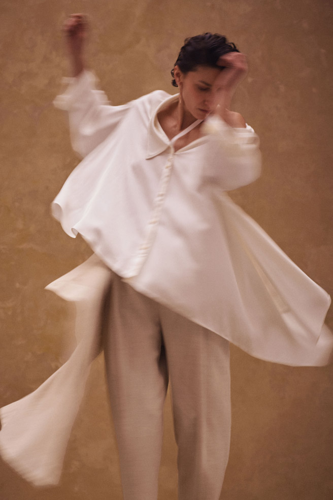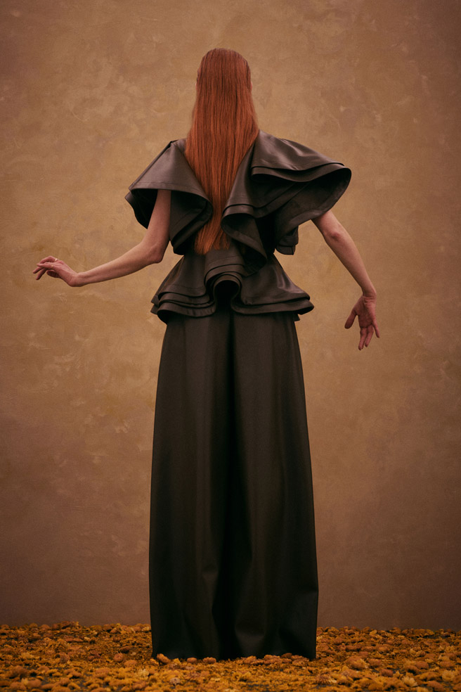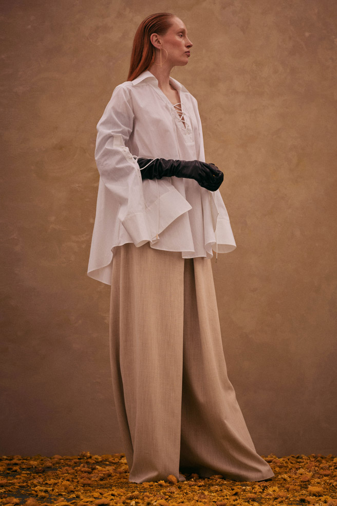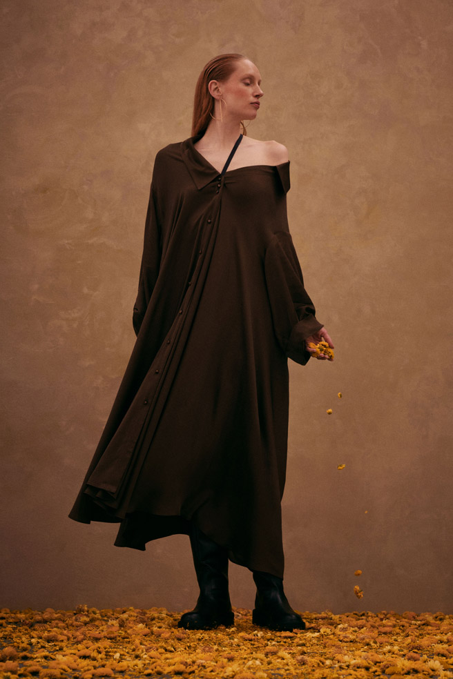 The collection begins with a seed of thought. The nurtured idea extends its supple roots and vines to break through hard trodden cracks of the earth. Across the collection this is reflected in details with deep splits and irregular lacing, representing the wandering of a seedlings first journey through the fractures in the soil, a reminder that anything of great worth requires perseverance. Silhouettes across shirts, dresses, trousers and knitwear are long and extended.