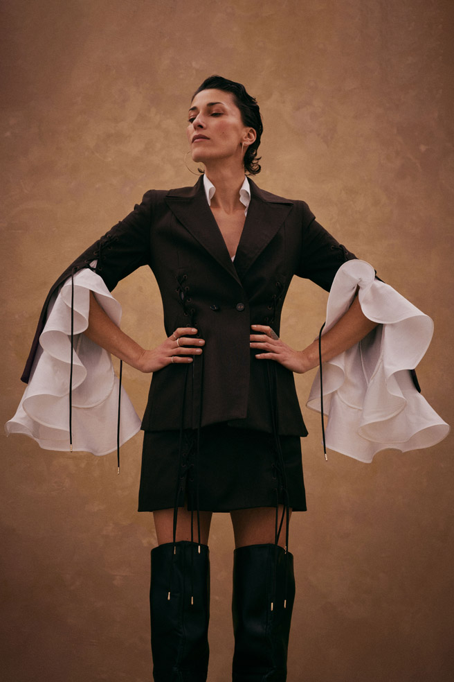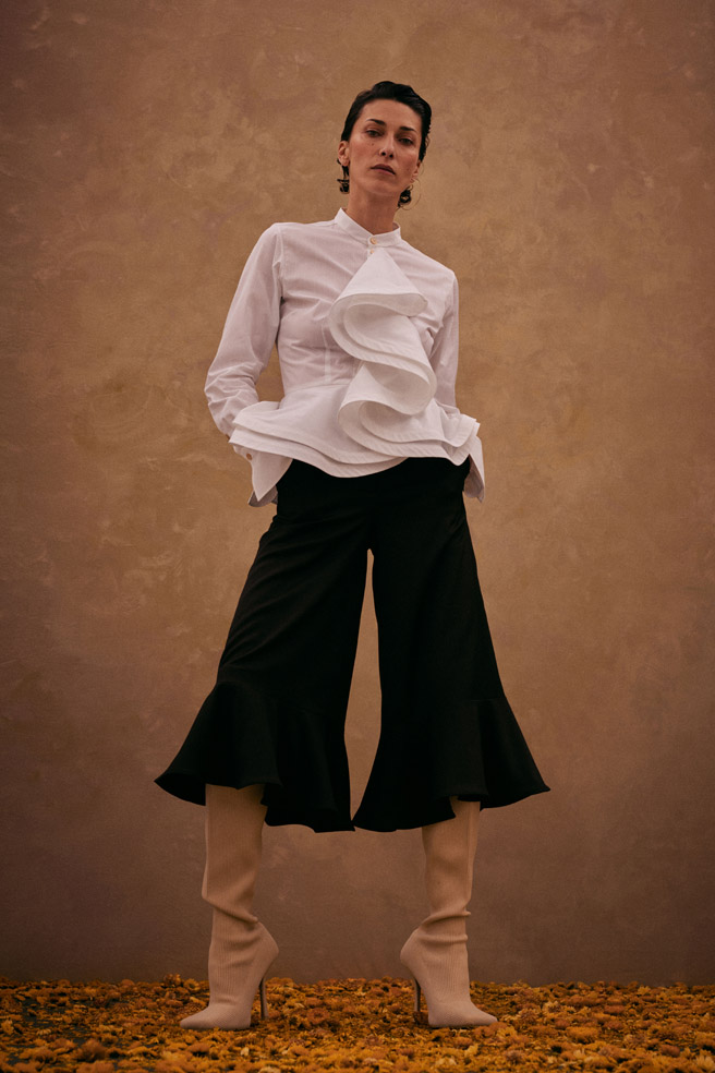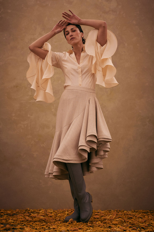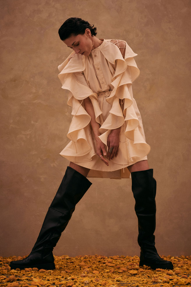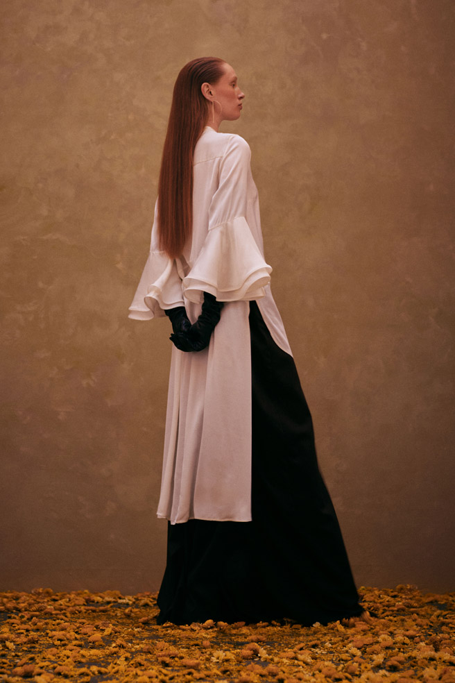 Once the idea sheds itself of the conventions it was confined to, it can open up, allowing authenticity to blossom. Here, joyous flounces reference the decadence of floral grandeur, applied across the cuffs, sleeves, hem lines and in some pieces fully encompassing the body. These majestic shapes, across dresses shirts and separates, are intricately crafted through the application of crinoline (typically a couture finishing) giving the flounces life, body and movement.