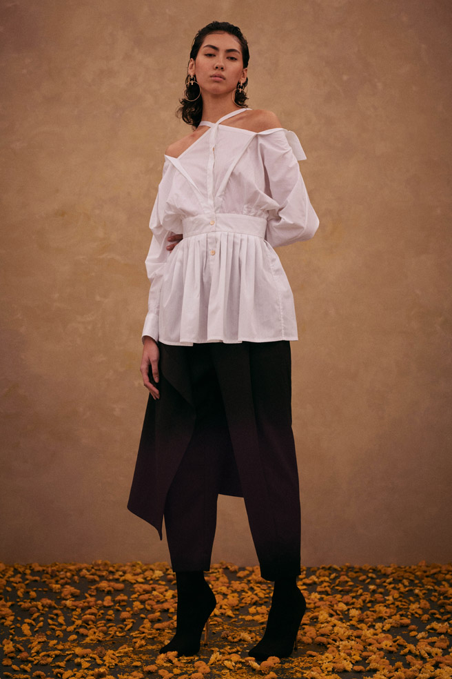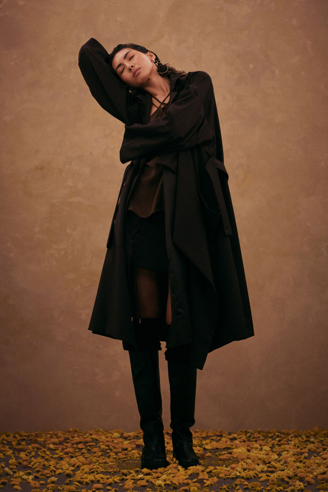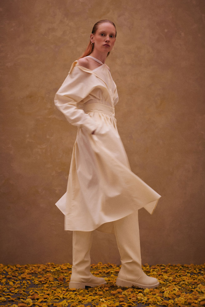 Once root has taken, the idea begins to bud. Influenced by its surroundings, the young idea sheds itself of preordained conventions and transforms into something new that suits its current state. Double layered elements in outerwear and transformable trousers fall away or detach completely, while dresses and shirts hang off the body in a delicate balance, as if ready to drop at any moment. Like a bud, detailing across these pieces reference the expectations that must be discarded to allow growth.