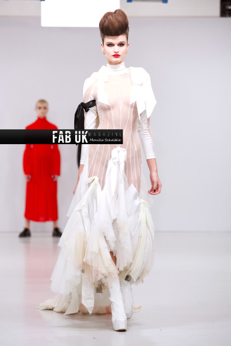 Crosses, sets of adult twins straight from the set of a horror film, lots of blood red, skin tight clothing – dare we say a bit fetish, a bird hanging on the front of a hat, crosses, crucifixes – these were the types of designs and themes at her show. Sure the designs are meant to shock, but the designs also titillate, seduce, and win you over.