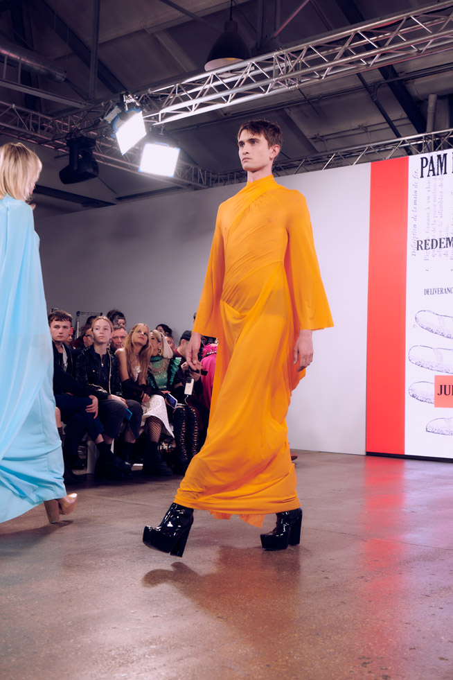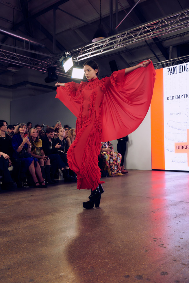 Dedicated to the late Sinead O’Connor, the collection was inspired by a striking vision of O’Connor enduring a fate similar to that of Joan of Arc, facing execution by burning at the stake. As Pam embarked on “Apocalypse,” a theme resonating with the world’s current state, thoughts of O’Connor persisted. The shocking news of her untimely passing abruptly refocused Pam’s attention once more. Sinead’s rendition of “Trouble of The World” became a focal point of deep emotion and prompted Pam’s choosing of her voice as the opening for the show—a voice that will eventually be heard and understood.