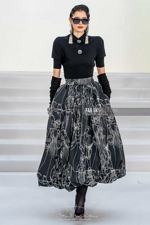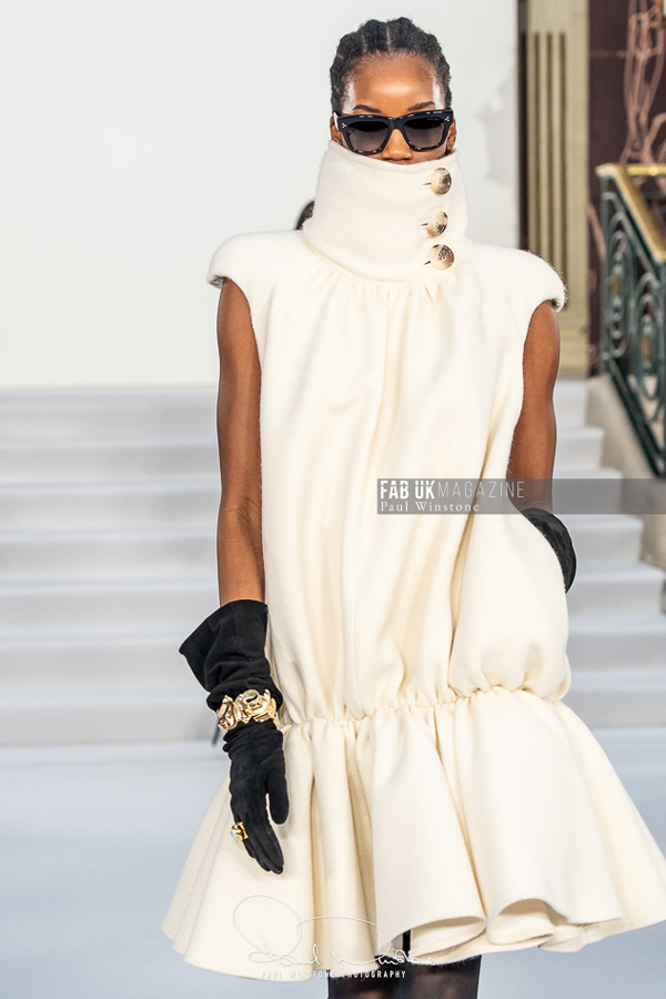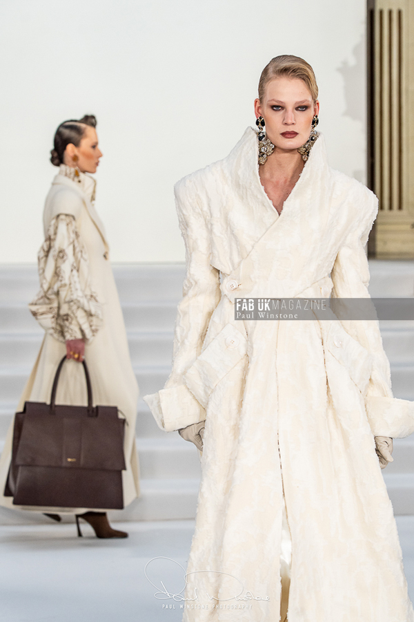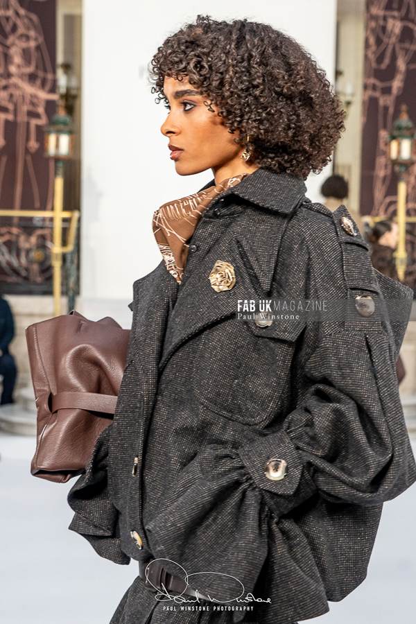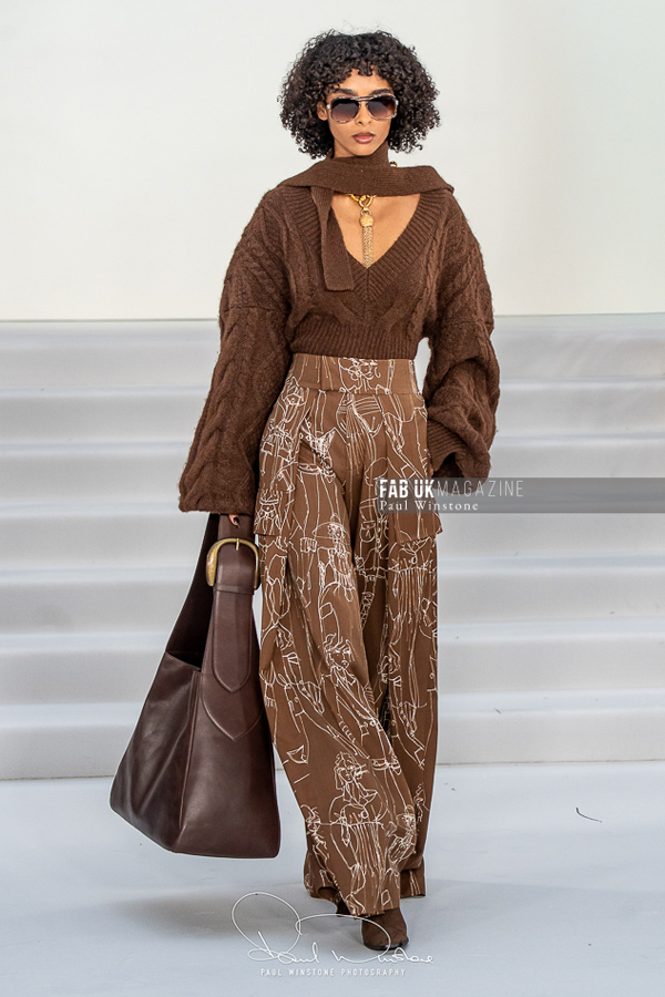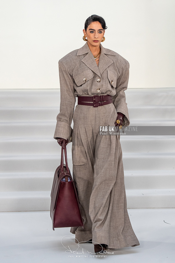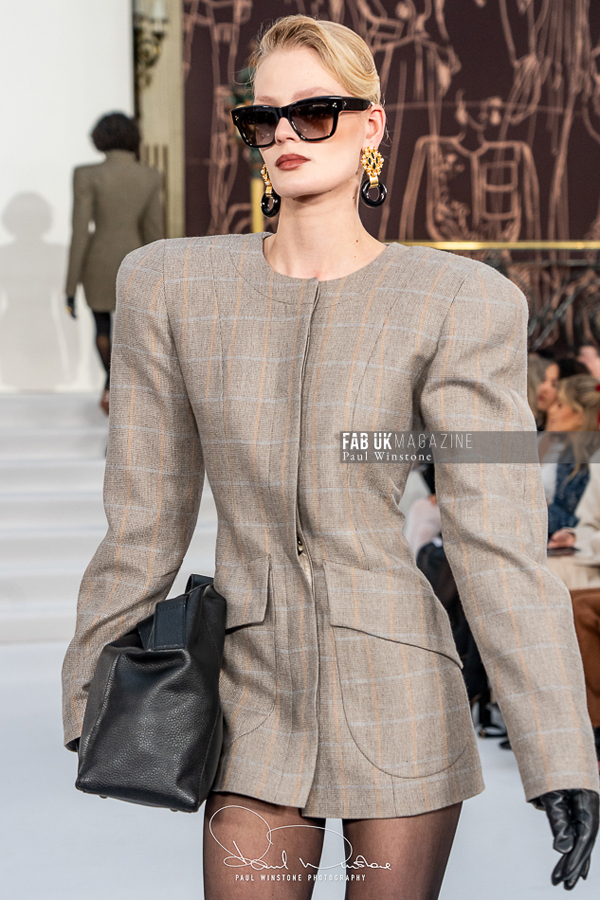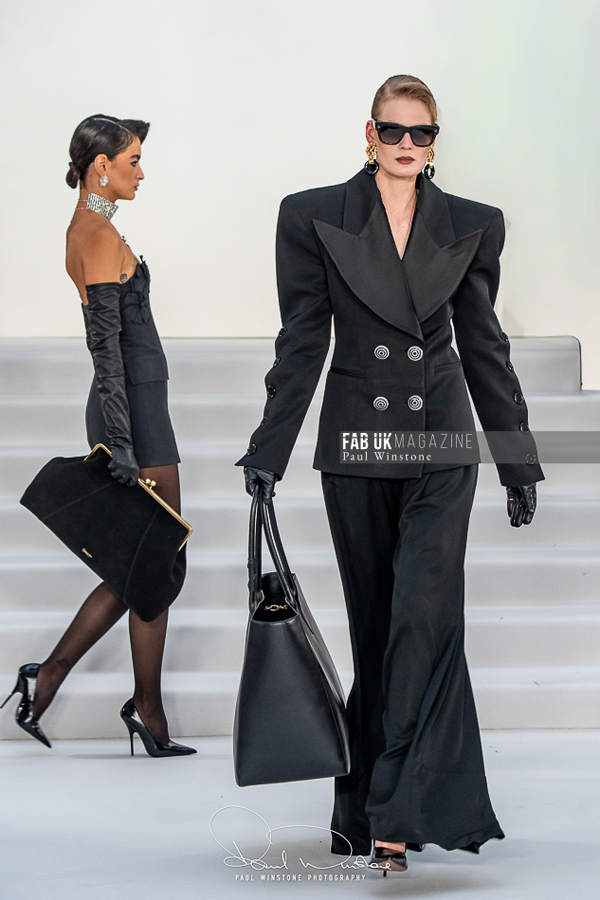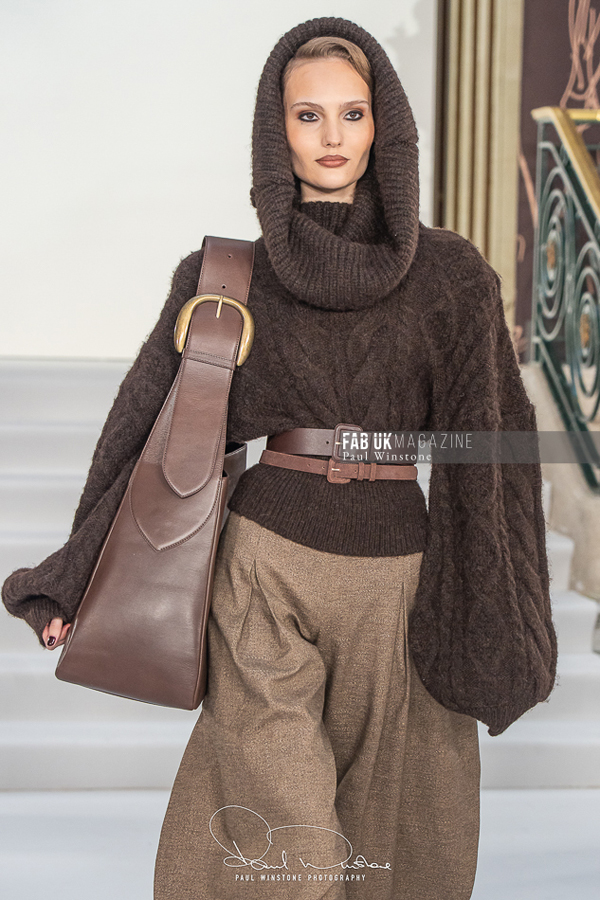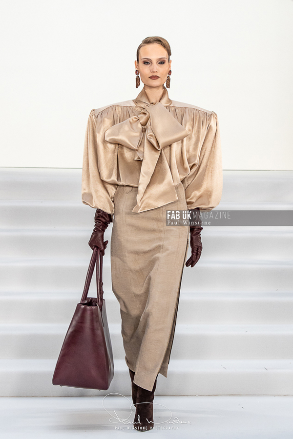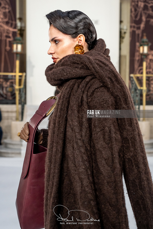 A refined interplay between structured and fluid fabrics was a recurring theme throughout the collection. Structured coats and corsetry were elegantly paired with silk and organza blouses, while oversized collars gracefully swept over the head. Wide pleated trousers introduced a sense of movement and ease. Tonal dressing, featuring blouses, ties, and colour-on-colour styling, further enhanced the sculptural tailoring. Knitwear played a pivotal role, with full cashmere rill and cable looks, large collars, and sculpted shoulders creating silhouettes that were both strong and elegant.