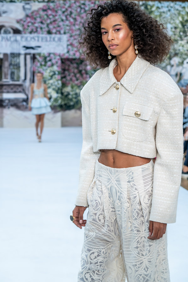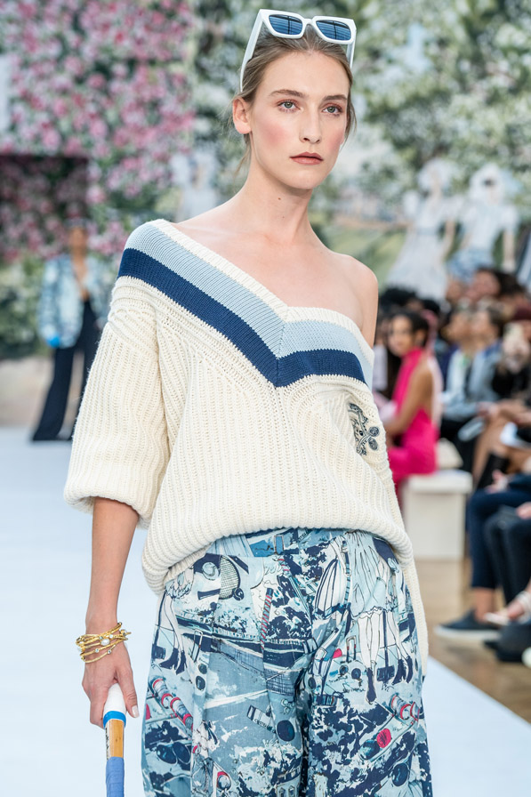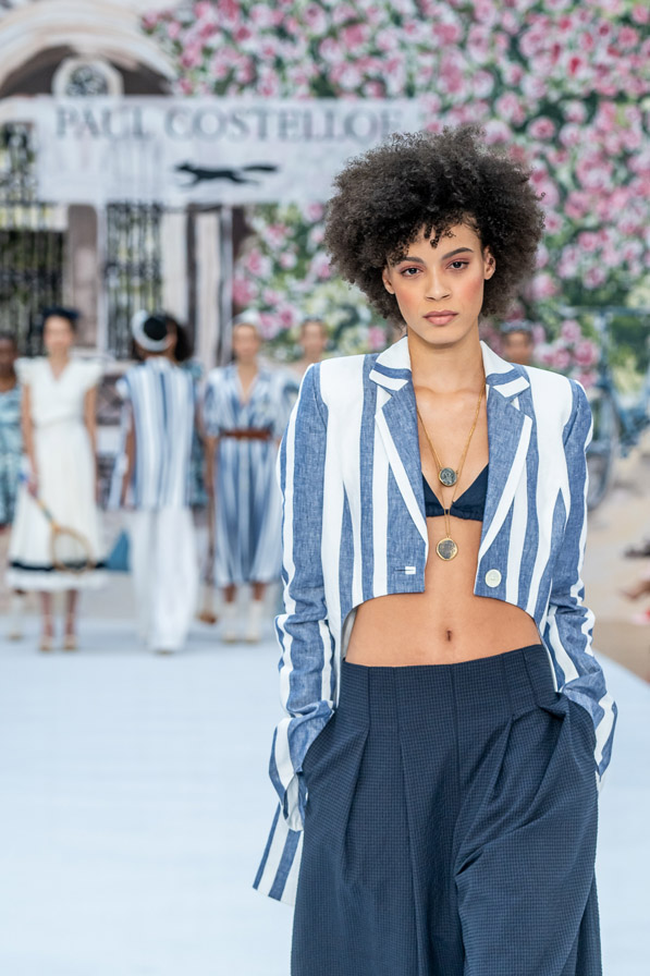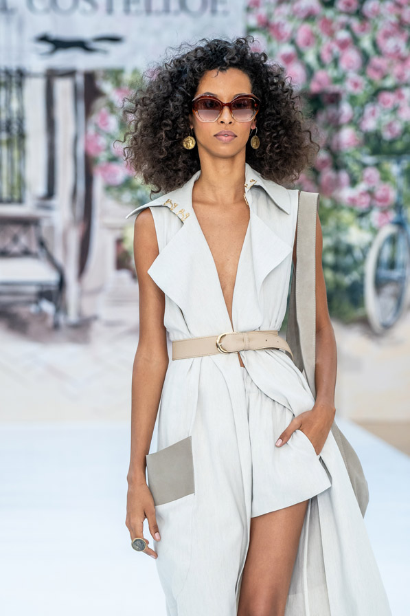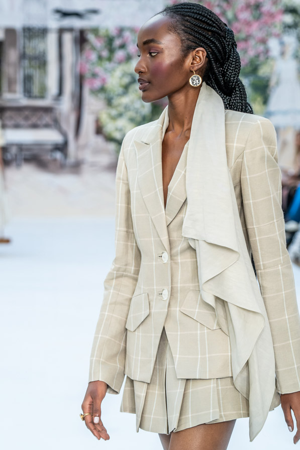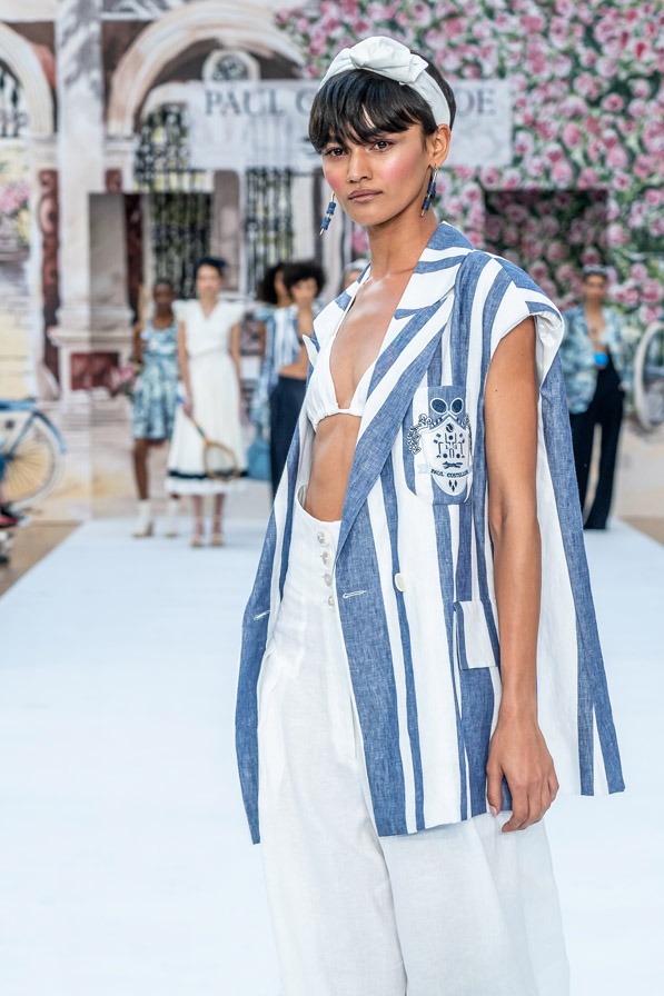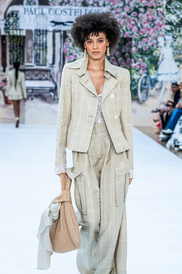 This season’s show called “il Giardino” (The Garden) transferred us to a tranquil afternoon in Italy. Paul introduced us to garden party romantic outfits in this collection, with unstructured jackets, striped sky-blue linens, and in-house prints. The dominant hues were a palette of ecru and sand shades, pale blues, and white. High-waisted, wide-leg linen trousers, short tops, cotton knitwear with statement Vs, gold braid trims, and oversized bags were also the theme. A noticeable trend was having bold statement headpieces, braided hair, and a combination of attires in a balanced, elegant way.