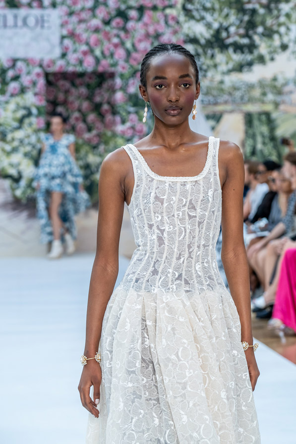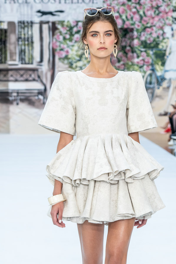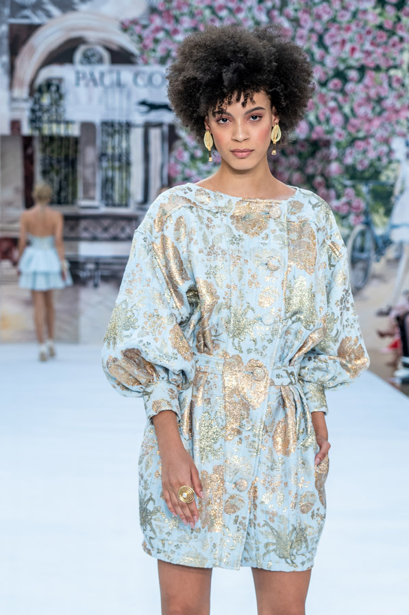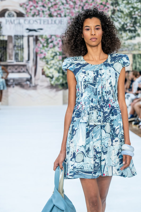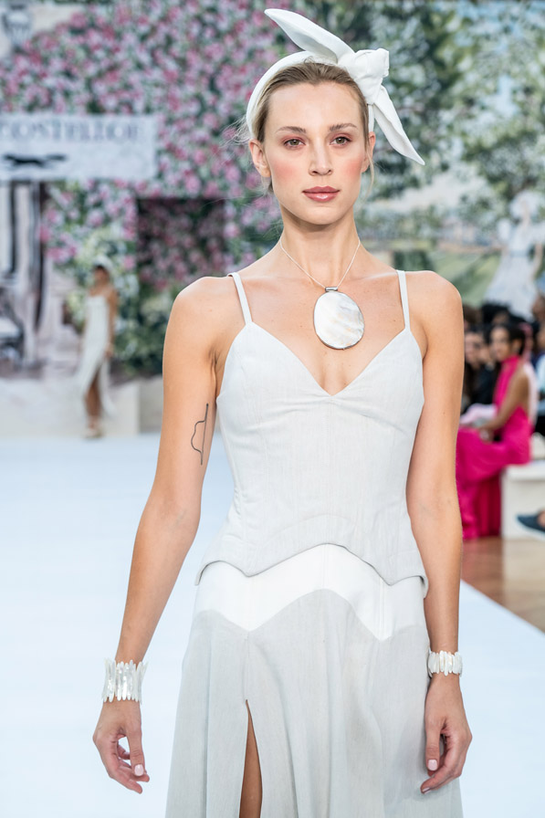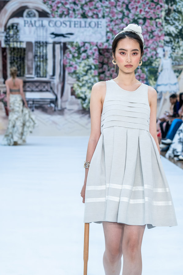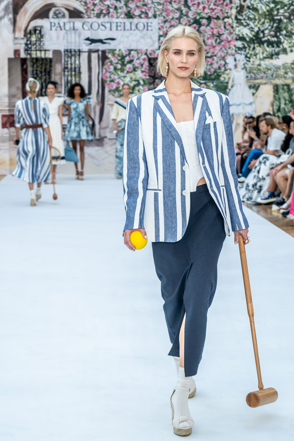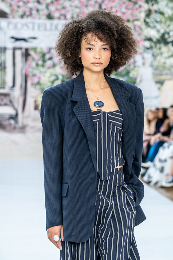 This season’s show called “il Giardino” (The Garden) transferred us to a tranquil afternoon in Italy. Paul introduced us to garden party romantic outfits in this collection, with unstructured jackets, striped sky-blue linens, and in-house prints. The dominant hues were a palette of ecru and sand shades, pale blues, and white. High-waisted, wide-leg linen trousers, short tops, cotton knitwear with statement Vs, gold braid trims, and oversized bags were also the theme. A noticeable trend was having bold statement headpieces, braided hair, and a combination of attires in a balanced, elegant way.
