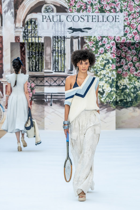 This season’s show called “il Giardino” (The Garden) transferred us to a tranquil afternoon in Italy. Paul introduced us to garden party romantic outfits in this collection, with unstructured jackets, striped sky-blue linens, and in-house prints. The dominant hues were a palette of ecru and sand shades, pale blues, and white. High-waisted, wide-leg linen trousers, short tops, cotton knitwear with statement Vs, gold braid trims, and oversized bags were also the theme. A noticeable trend was having bold statement headpieces, braided hair, and a combination of attires in a balanced, elegant way.