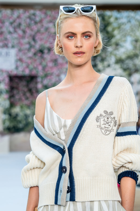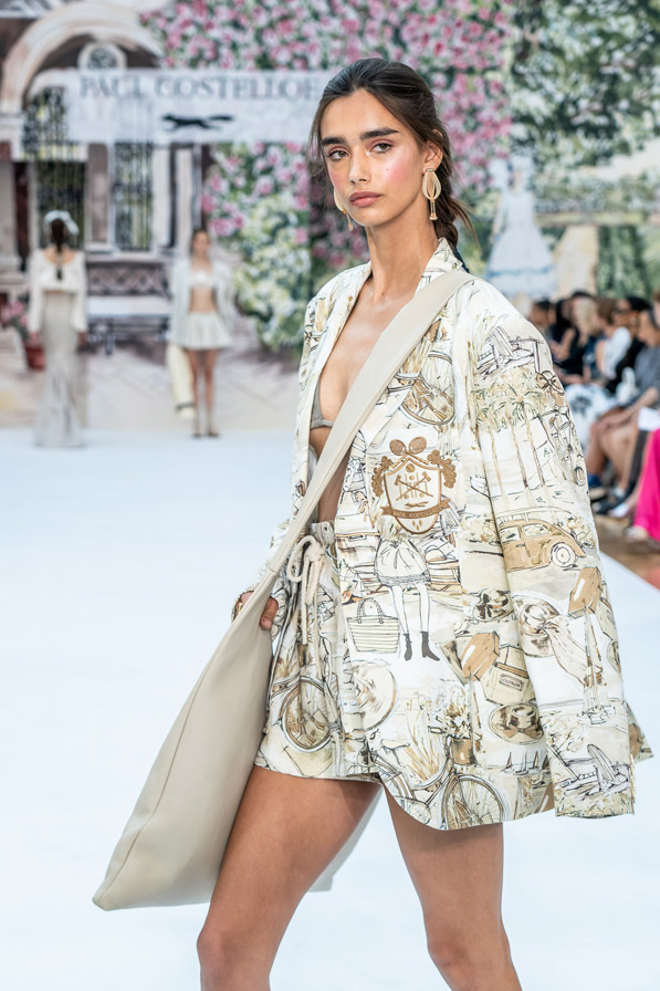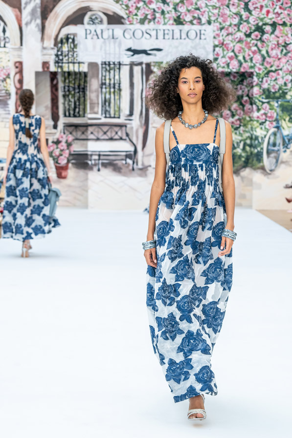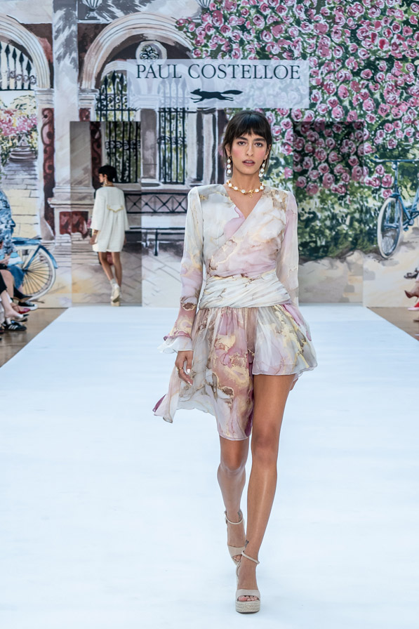 Striped linens in sky blues are presented in romantic dresses and unstructured jackets, adorned with the Paul Costelloe Sports crest, along with in-house family narrative prints, in shades of ecru, sand and pale blues.