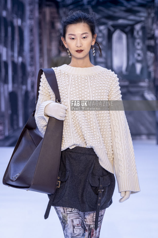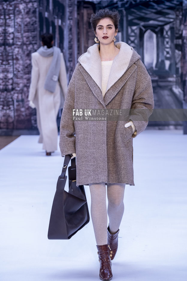 The colour palette echoed sophistication, featuring winter whites, chic charcoal greys, and opulent brown Donegal tweeds expertly trimmed in leather. Standout pieces included a giant tweed jacket with an oversized hood, showcasing Costelloe’s ability to merge practicality with high fashion.