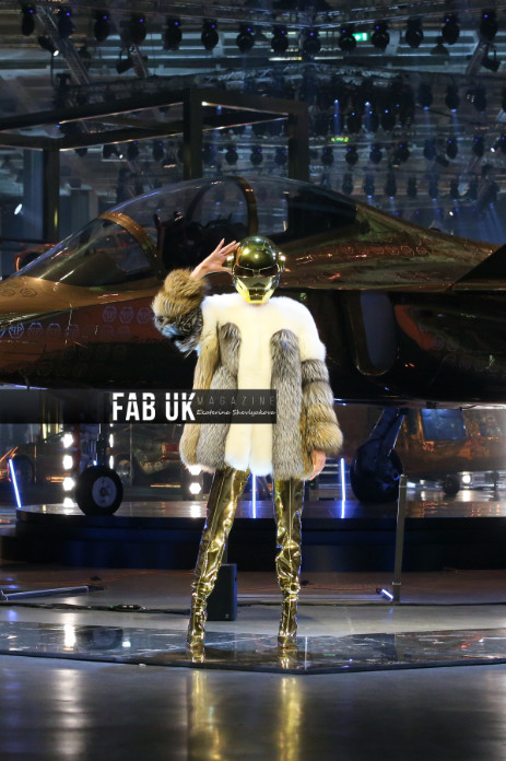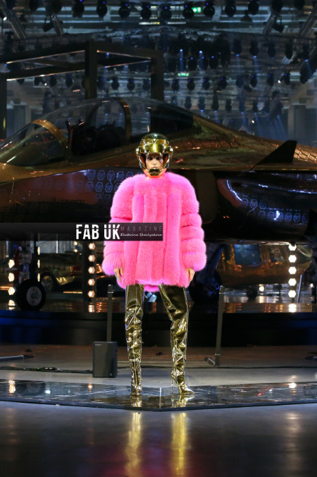 The enormous location (the Milan Fair) was literally shining bright being decorated by “golden” helicopters, planes, cars and boats situated in the main room near the catwalk. The number of luxury objects shown was overwhelming. Gold was the colour of the evening with all the lights being extremely yellowish. The show started when Plein himself appeared on stage. He presented his new collection of ladies’ and gents’ outfits as well as the new perfume “No Limits”. Phillip made a little speech suggesting everybody to believe in themselves like he did when he started his designer career.