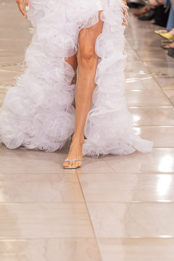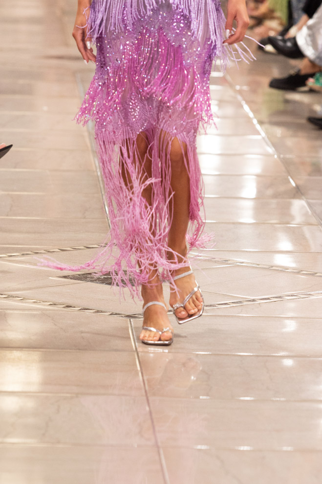 Among the standout pieces is the Cinderella mule, adorned with crystals and crafted from vinyl, featuring a delicately coloured injected heel that perfectly complements the vinyl tone. Additionally, the classic Chiara has undergone a transformation, exchanging Piazza’s iconic crystal brooch for a delicate bow embroidery reminiscent of PatBO’s runway pieces. Notably, the Murano heel, fashioned from jute, introduces an innovative element to Piazza’s portfolio.