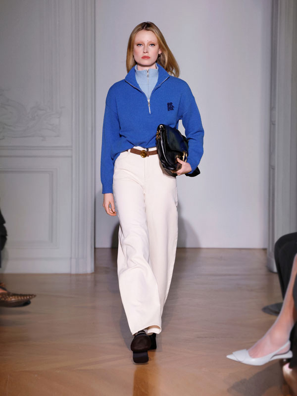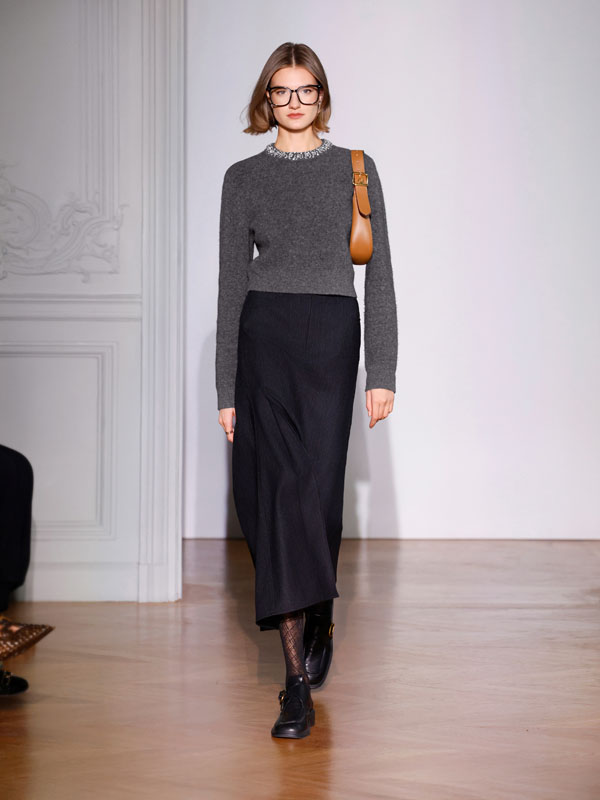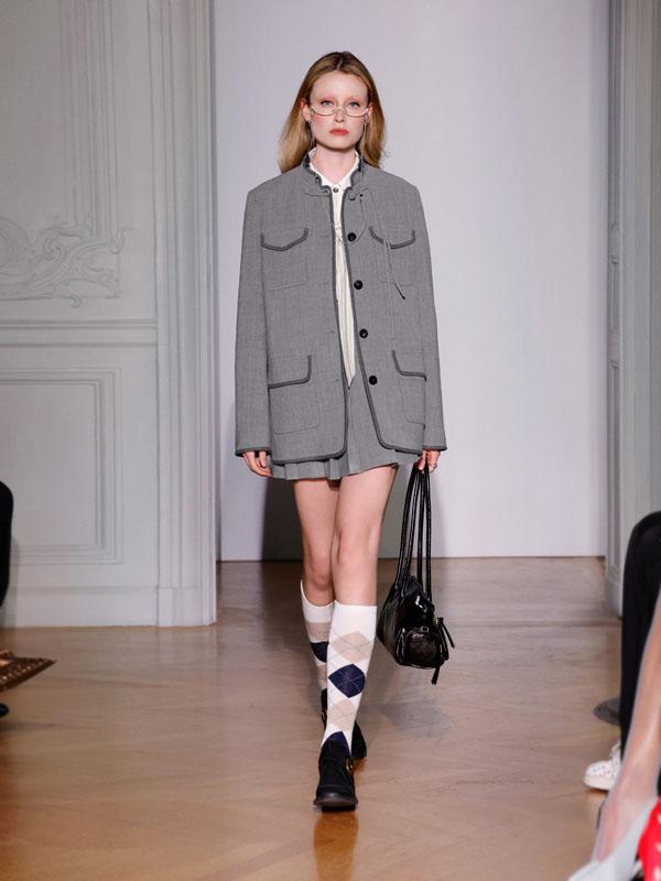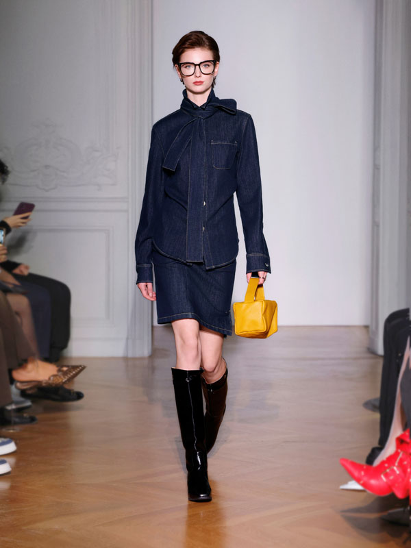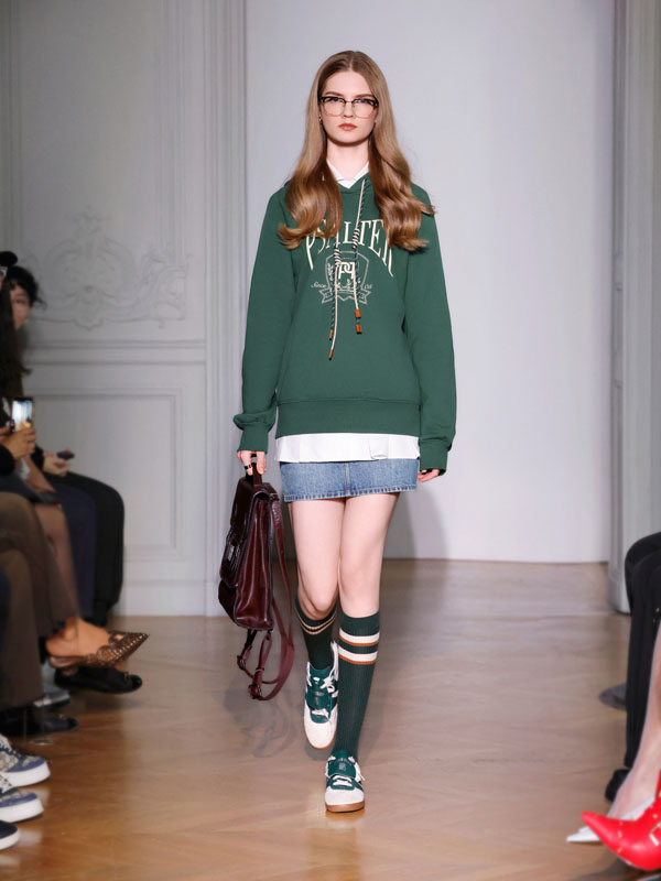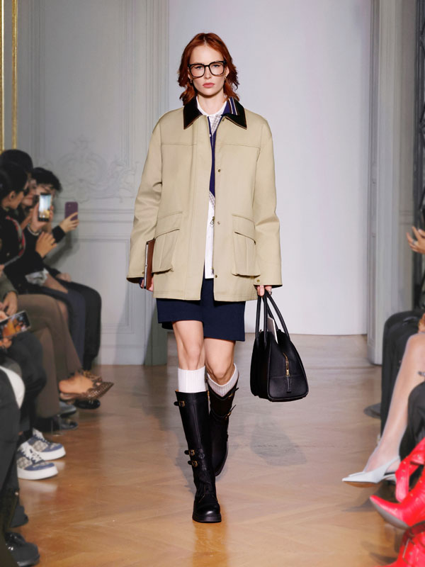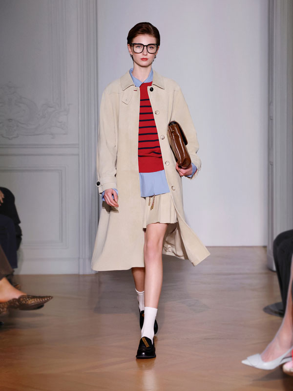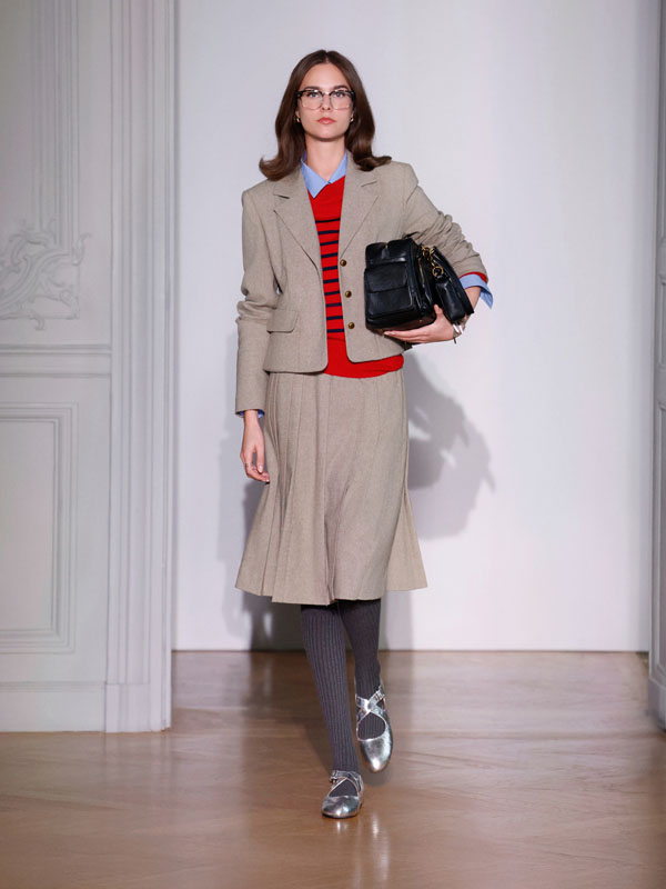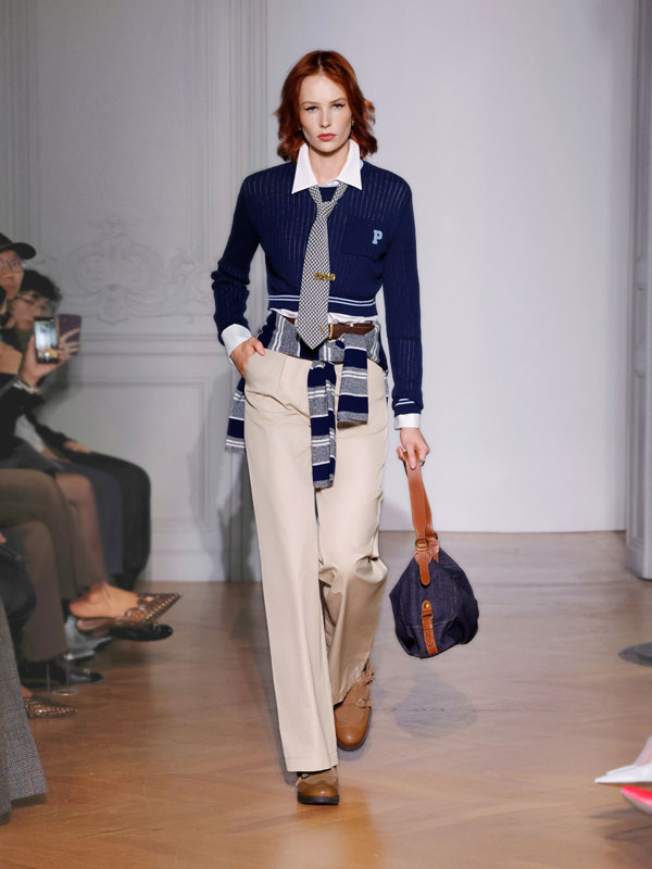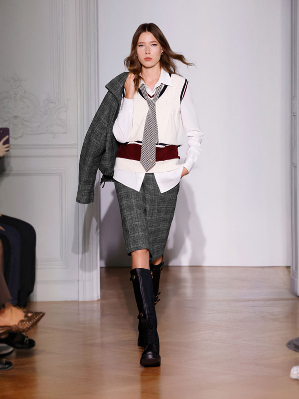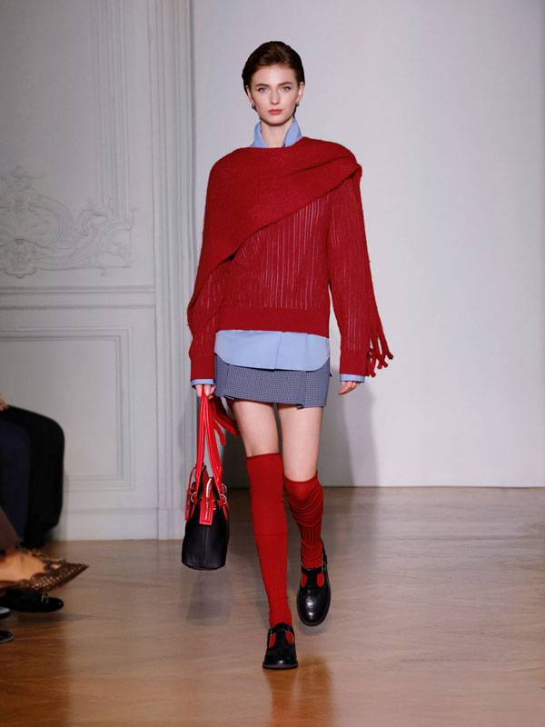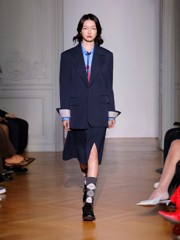 The color palette balanced rigor and vibrancy: classic academic blues and browns were enhanced by seasonal hues of smoky violet, warm red, and creamy yellow. Rich yet subtle, these tones broke away from the monotony of fall-winter shades. Combined with structured or airy fabrics, they shaped an aesthetic both disciplined and spirited.
