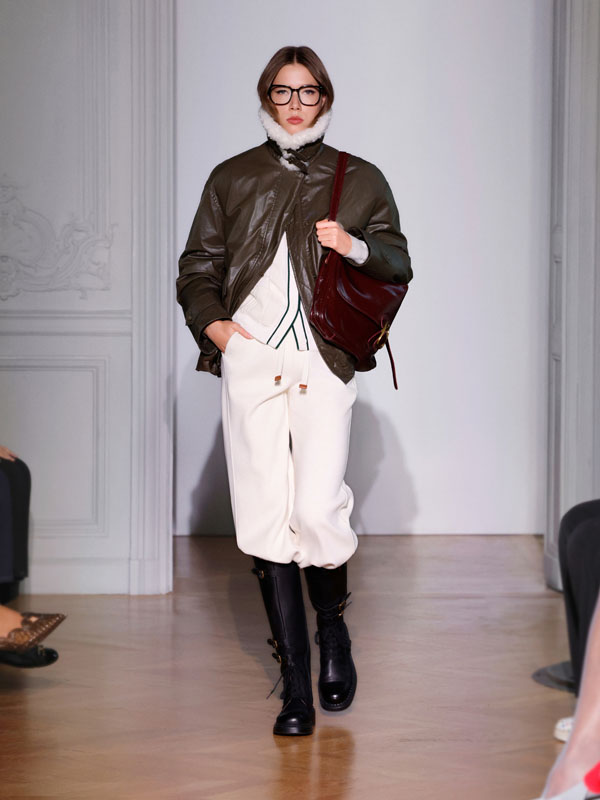 The show revolved around a play of contrasts and mix-and-match. Signature checkered coats, tailored blazers, sleek leather jackets, color-blocked knits, and casual daytime ensembles were layered with bold juxtapositions. Codes intertwined to create a coherent fusion where timeless elegance met modern independence, reflecting the multifaceted character of today’s feminine silhouettes.