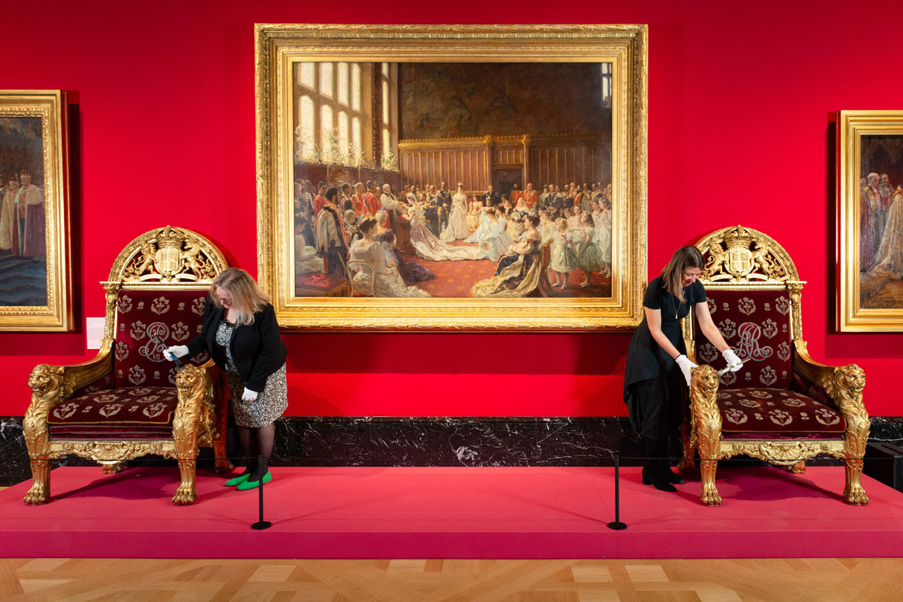 Accompanying the dress are various royal treasures, including the diamond necklace and earrings gifted to Alexandra by Edward VII, her ostrich feather fan adorned with diamonds, and the couple’s cloth-of-gold coronation mantle. Visitors can also view the royal thrones, designed by a French firm, and the iconic state portraits by Sir Samuel Luke Fildes.