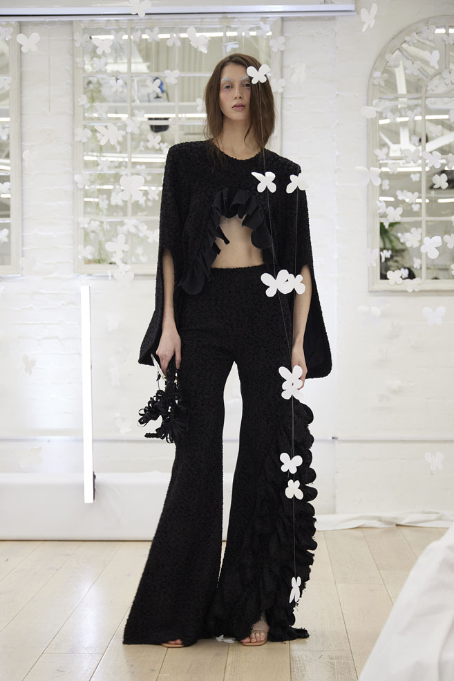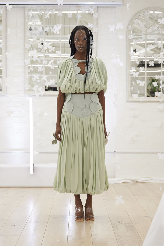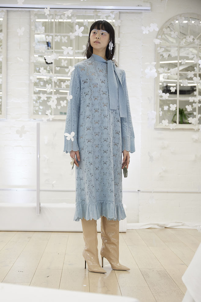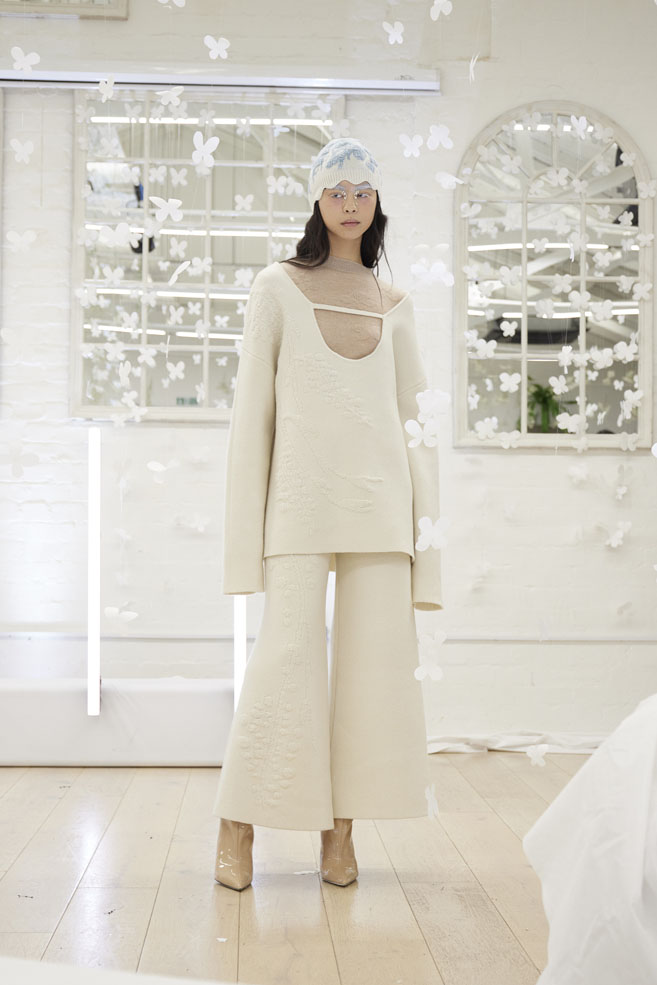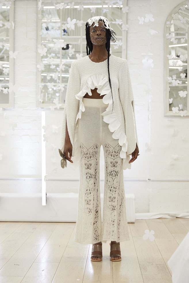 The AW23 series is full of soft puffy silhouettes, pleatings, and ruffles that gently wrap around the body. The designer hopes to convey a sense of security within the collection, seeing the person enveloped in softness. r.l.e continue to celebrate their most prominent muse within their AW23 collection, the authentic beauty of nature. The intricate details found in flowers, butterflies, and branches inspire the knitted elements of the design as well as various other fabrics.