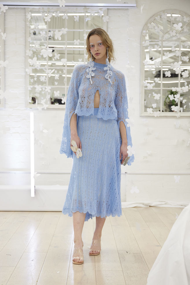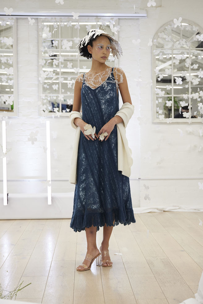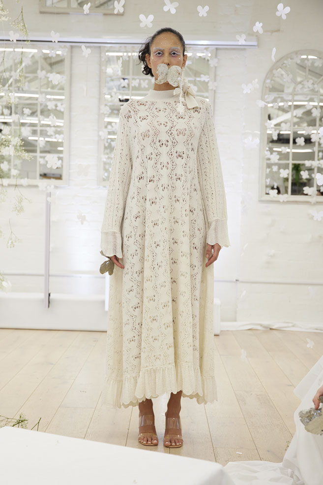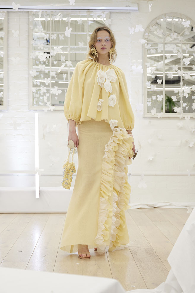 For their AW23 collection, r.l.e continues to deepen and develop its sustainable journey. The brand continues collecting the cut-off fabrics and remaking them into 3D yarns, transforming them into garments or accessories by utilising weaving and crochet techniques. The white hanging butterflies seen in the set design of the AW23 presentation come from the cut pieces of pattern paper; they are a by-product of the development of the collection, re-engineered, and cut into the key inspirations of AW23. A sustainable romance by r.l.e; everything has a chance to be made beautiful again. r.l.e continues the collaboration with jewellery designer Sara Chyan, choosing metals with a low melting point to create unique flowing jewellery pieces. The flowing metallic feel represents the metaphor between butterflies and flowers.