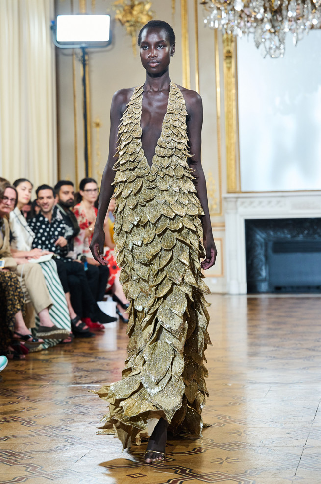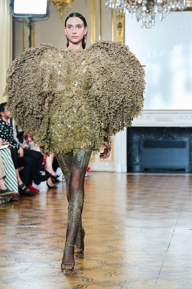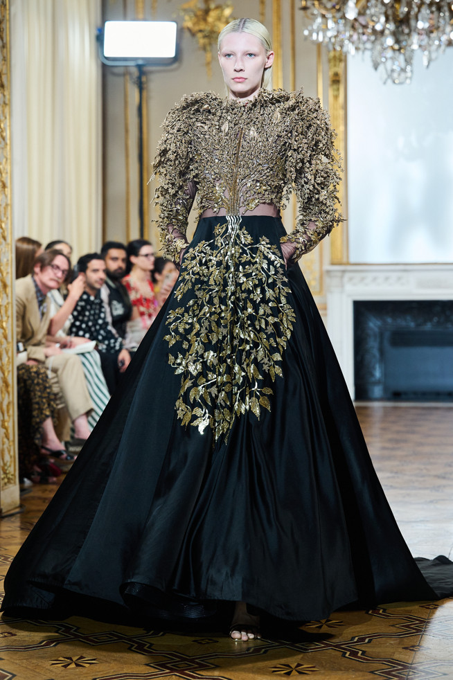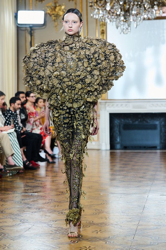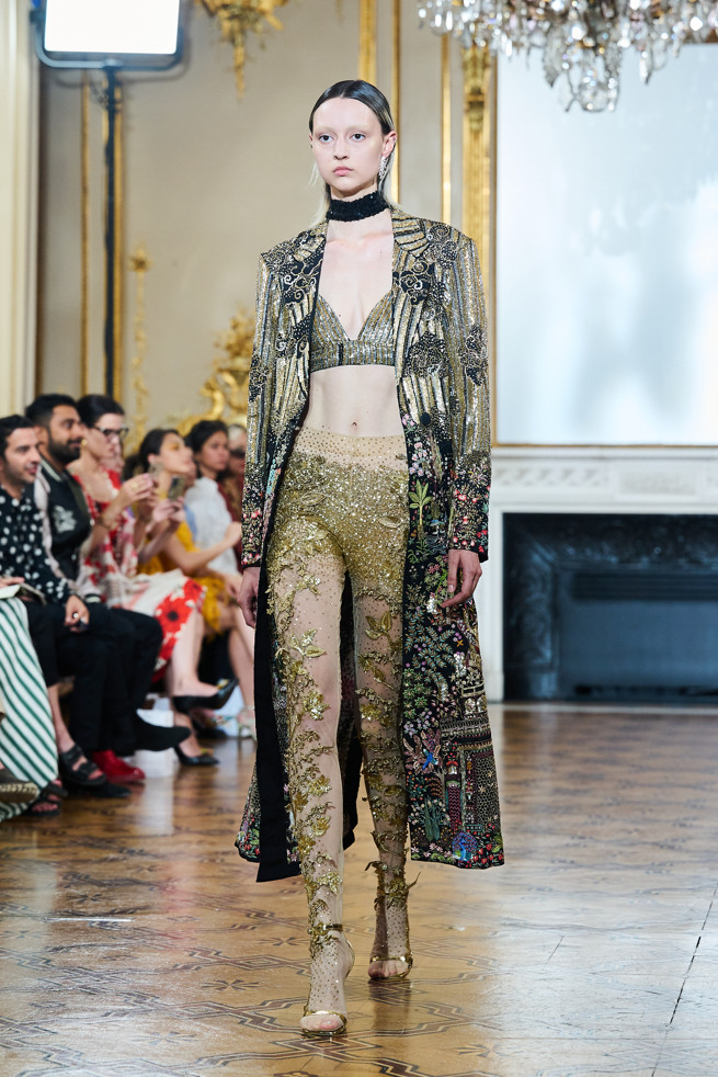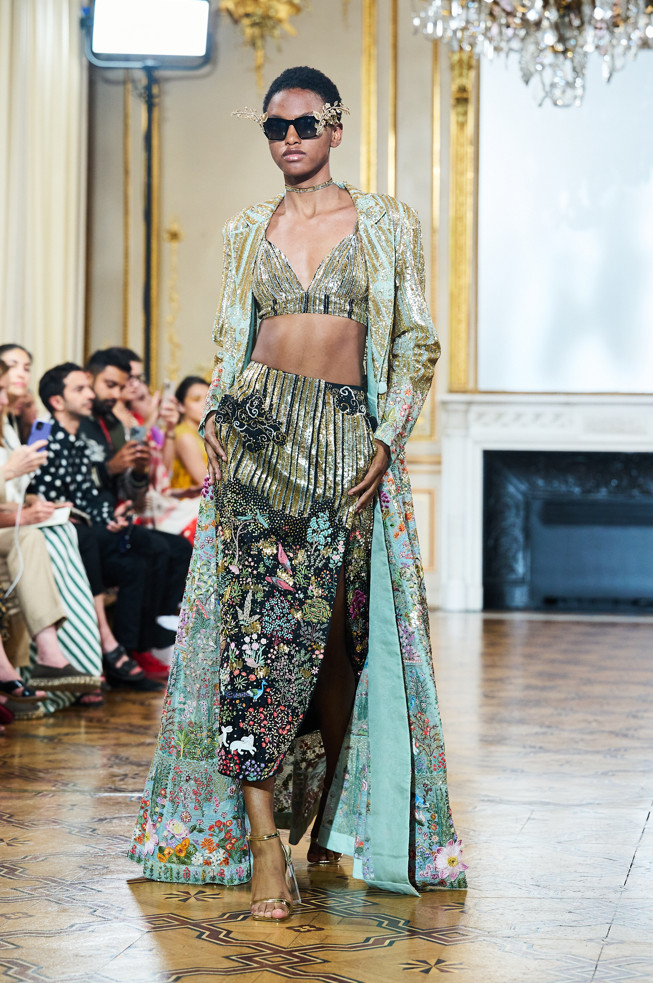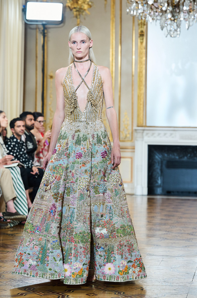 In this collection, two and three dimensional embroideries articulate the first flush of nature emerging on the surface of a body, and life that grows from it. Intricately embellished artworks articulate scenes from dense forests with ancient architectural remains and vegetation in modern day silhouettes. A fresh application for the brand, metallics add another dimension to our brand’s signature hand craft. True to the values of ‘Haute Couture’, pieces feature fabrics that are handwoven in remote locations in India, embroidered with hand for over 10,000 human hours and sewn to perfection for clothing that is featherweight despite its convoluted surfaces.