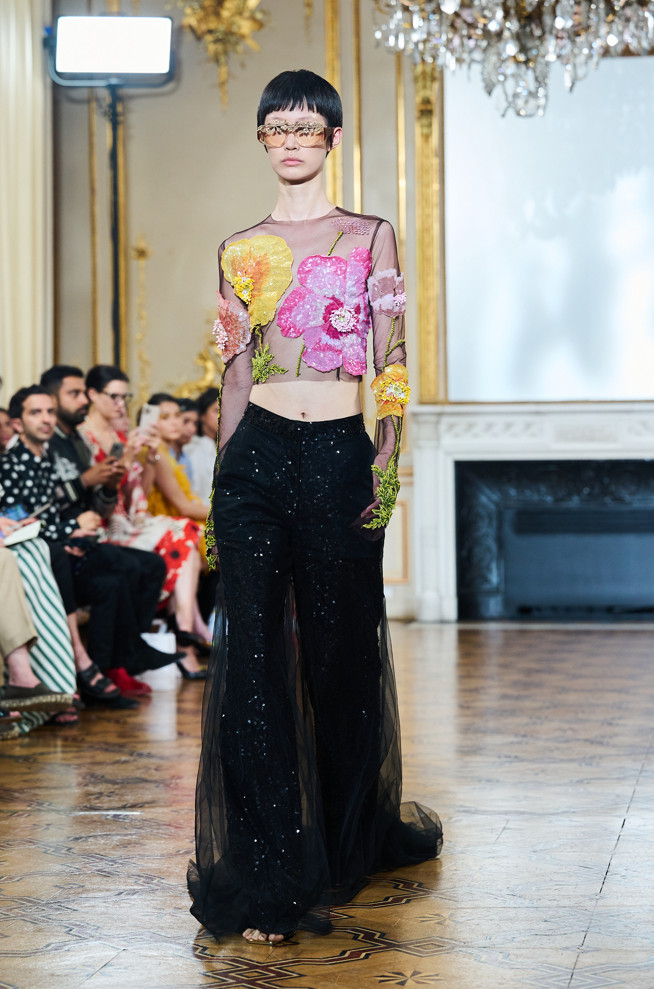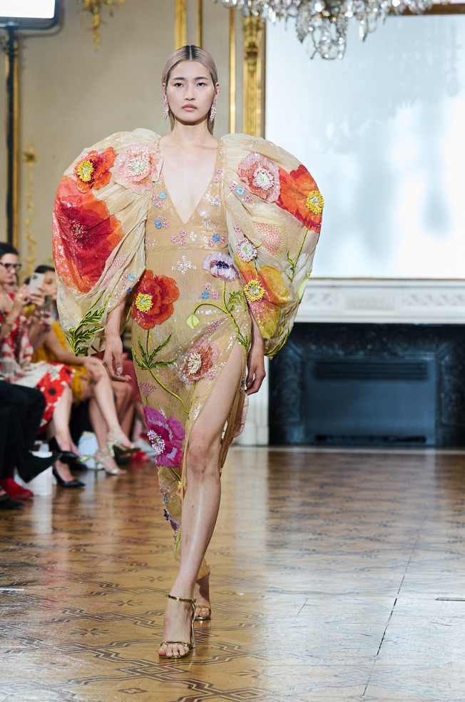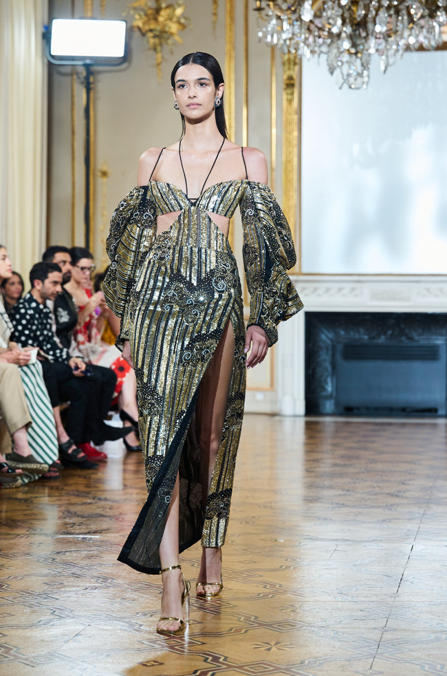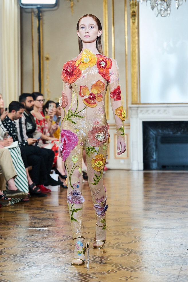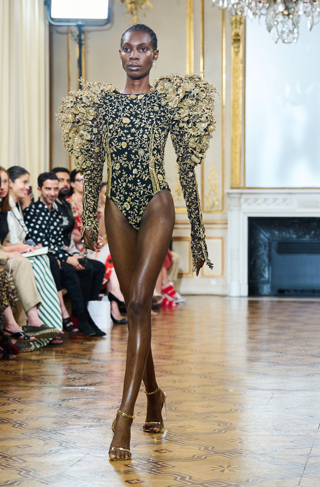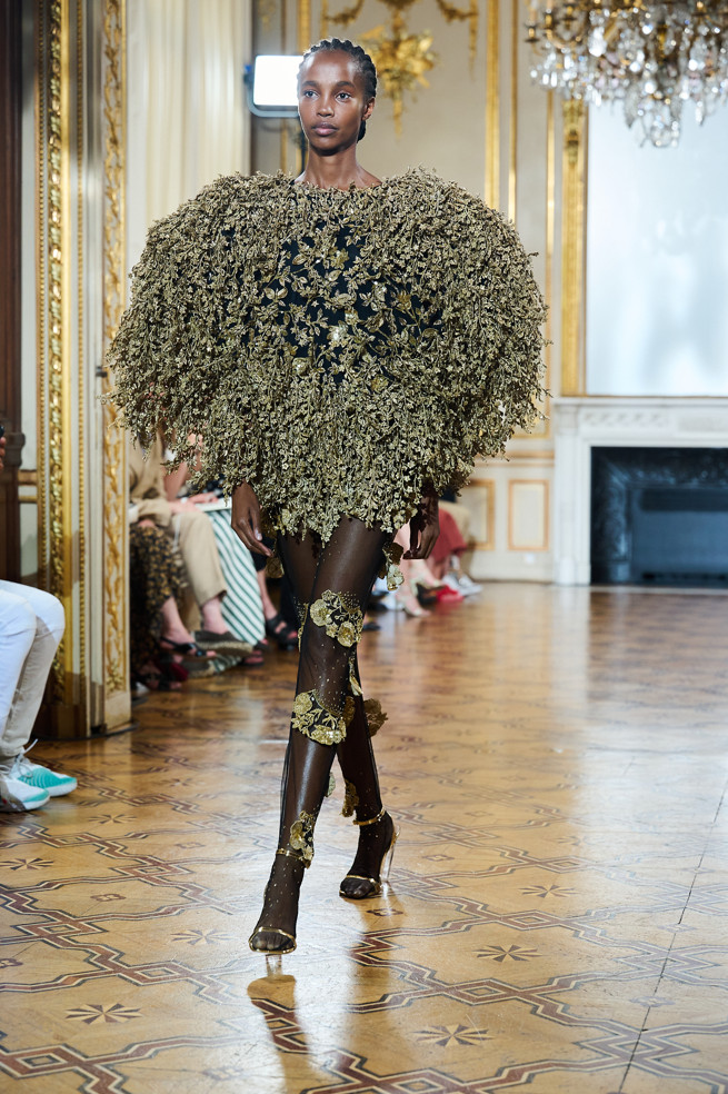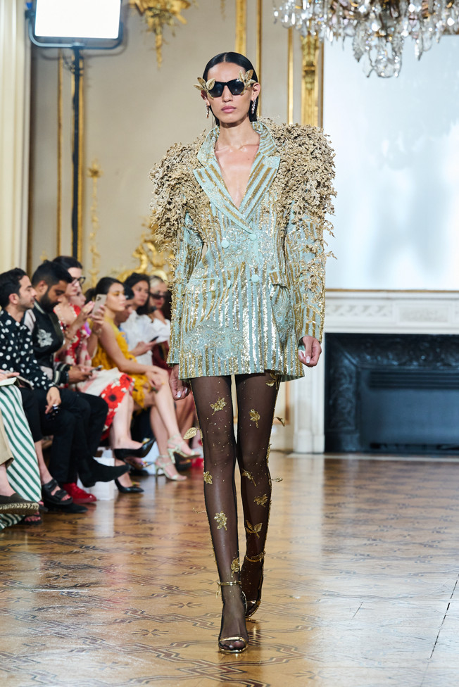 In this collection, two and three dimensional embroideries articulate the first flush of nature emerging on the surface of a body, and life that grows from it. Intricately embellished artworks articulate scenes from dense forests with ancient architectural remains and vegetation in modern day silhouettes. A fresh application for the brand, metallics add another dimension to our brand’s signature hand craft. True to the values of ‘Haute Couture’, pieces feature fabrics that are handwoven in remote locations in India, embroidered with hand for over 10,000 human hours and sewn to perfection for clothing that is featherweight despite its convoluted surfaces.