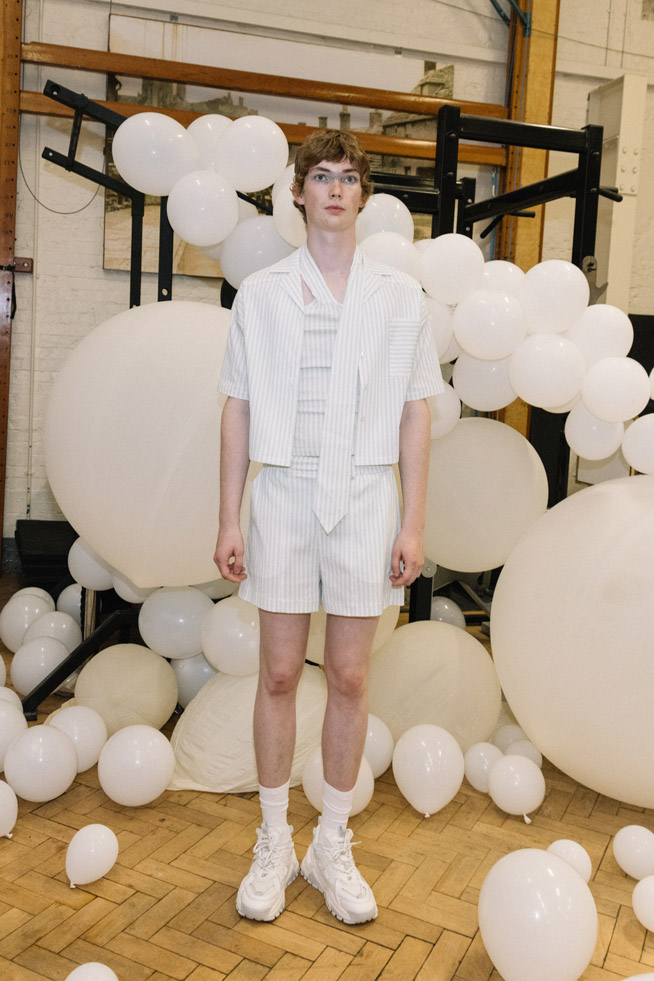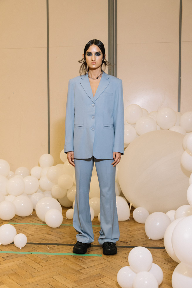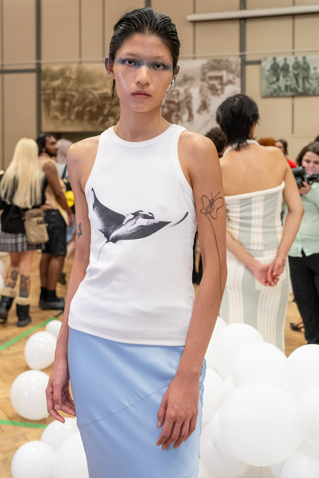 To fulfill higher sustainability goals, 80% of the fabrics this season consist of natural materials. Collaborating with Taiwanese manufacturers, Chu has created fabrics with fish-scale textures and utilized the latest biodegradable polyester fibers. Ray Chu have managed to seamlessly align their marine inspirations with their conscious design, paying homage to the beauty of the ocean and fulfilling the brands commitment to environmental responsibility.