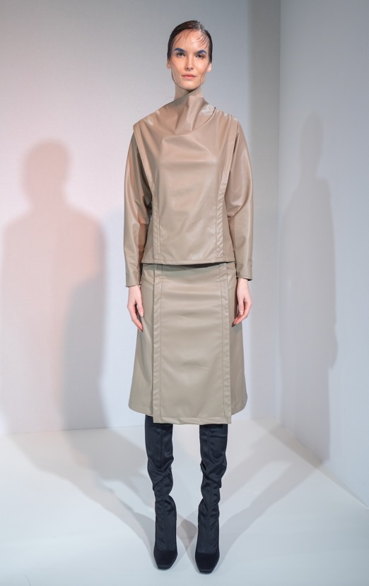 Taking inspiration from the working woman’s apron and blending this with modern tailoring, Riona Treacy’s AW19 collection celebrates hand dyed prints, using colours and textures that reference a traditional source of income, pulling from the marbling patterns on bank notes, and metallic tones of old coins. With the use pure wool, silk jersey, rich velvet and vegan leather, each piece has been designed to take the wearer elegantly from day to night or office to evening.