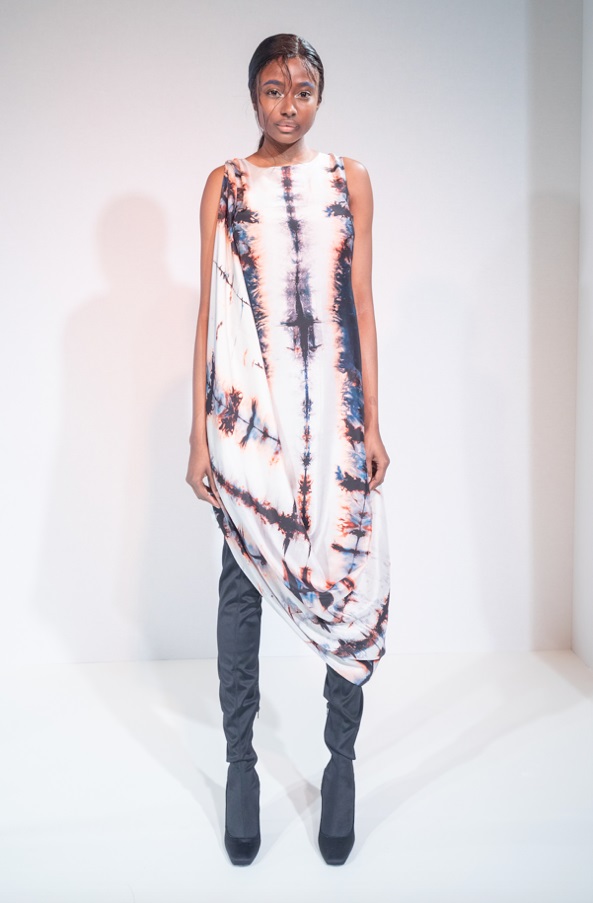 Taking inspiration from the working woman’s apron and blending this with modern tailoring, Riona Treacy’s AW19 collection celebrates hand dyed prints, using colours and textures that reference a traditional source of income, pulling from the marbling patterns on bank notes, and metallic tones of old coins. With the use pure wool, silk jersey, rich velvet and vegan leather, each piece has been designed to take the wearer elegantly from day to night or office to evening.
