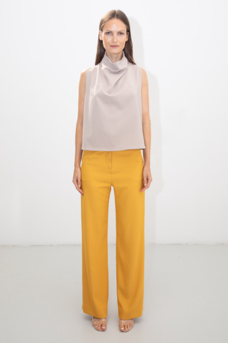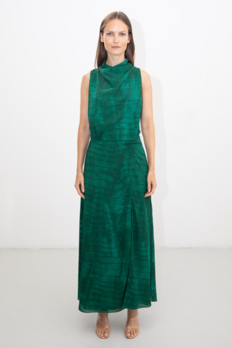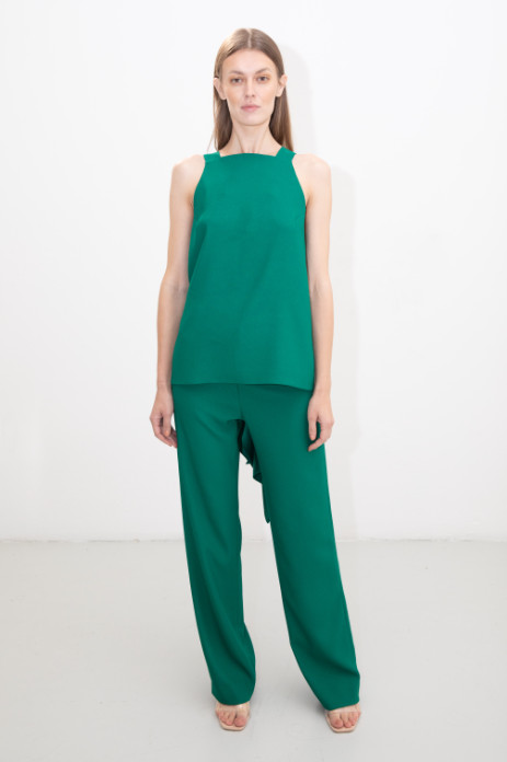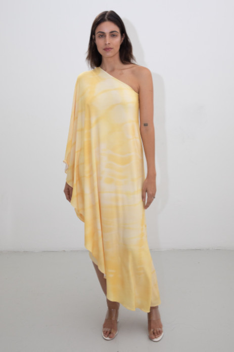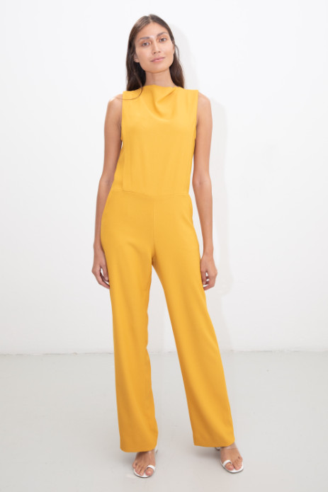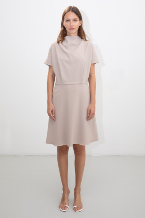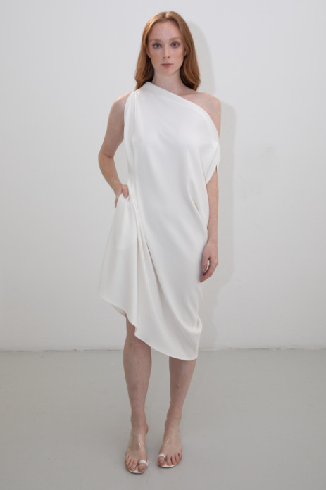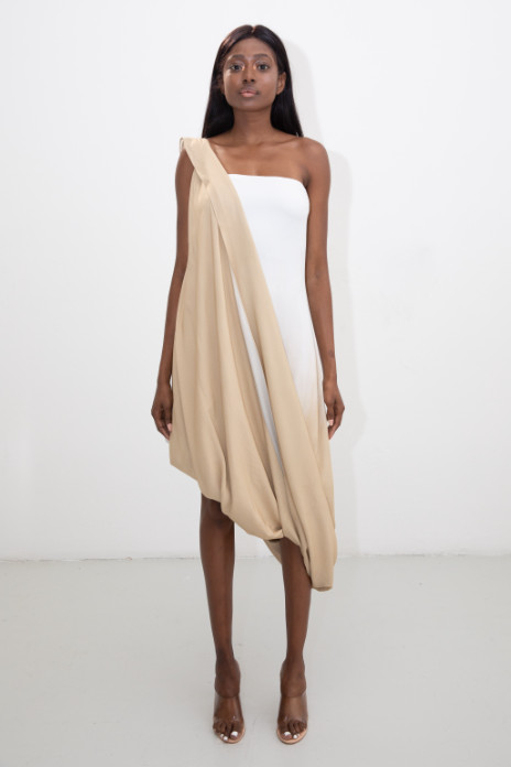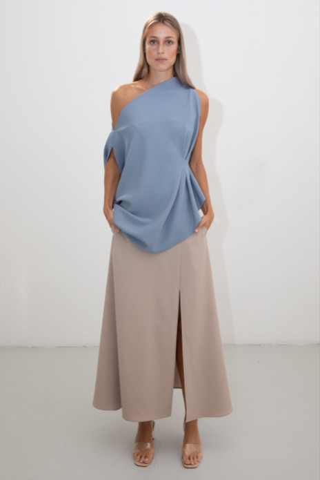 There is an almost origami-like aesthetic running through the collection, where the square shape of the post-it note is frequently referenced through alternative tailoring and the unexpected draping of right angles. A great example of this pared-back aesthetic is our asymmetrical Rhombus Dress, crafted from one continual square piece of fabric and cleverly draped across the body to create a flattering silhouette.
