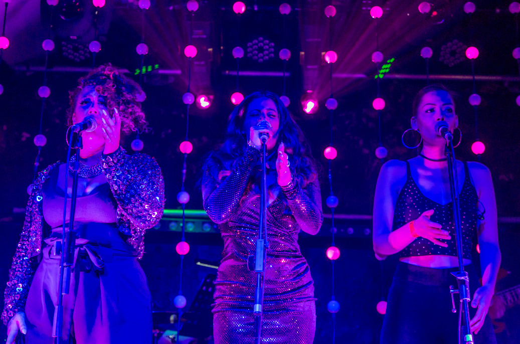 As the masses rounded up in the queue and proceeded to flood the dance floor, a red hazy tint in the room lit an empty stage packed with instruments and equipment. We waited in anticipation for Rogue Symphony to come on. Suddenly the crowd went wild and on came the singers, strings, drums, guitar, bass guitar, keyboard and horn section! Yes, that’s right we were witnessing a 14 piece band on a pretty cosy stage!