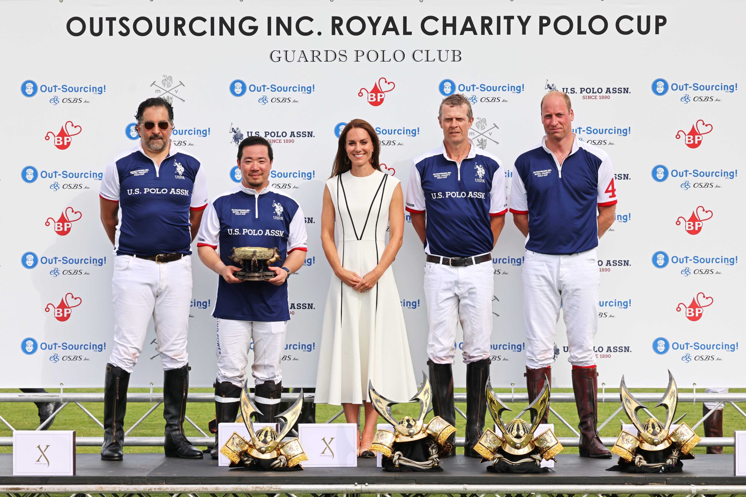 EGHAM, ENGLAND – JULY 06: Catherine, Duchess of Cambridge (C) presents the trophy to (L to R) Amr Zedan, Aiyawatt Srivaddhanaprabha, James Harper and Prince William, Duke of Cambridge at the the Royal Charity Polo Cup 2022 with Audi at Guards Polo Club on July 6, 2022 in Egham, England. Pic Credit: Dave Benett
