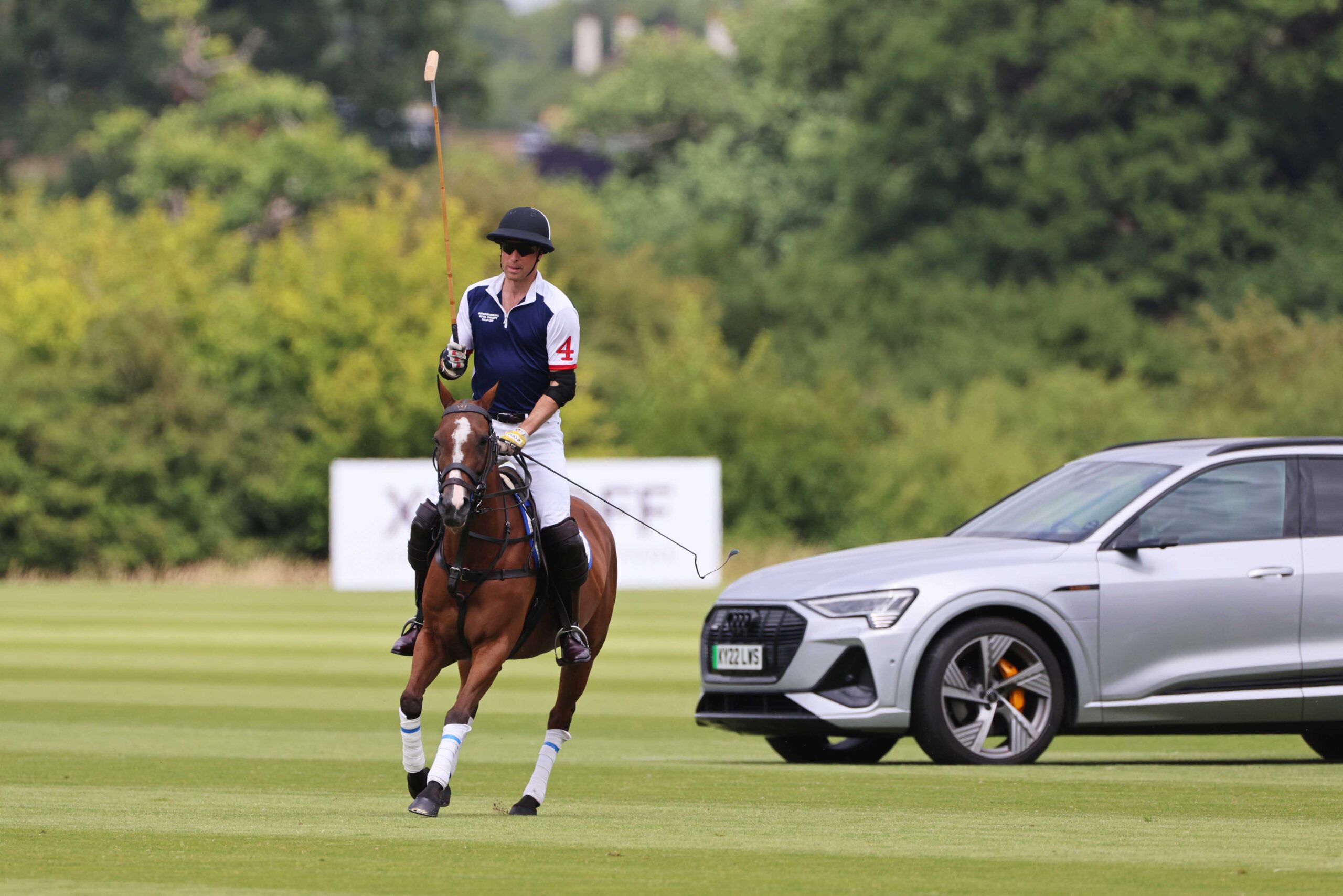 EGHAM, ENGLAND – JULY 06: Prince William, Duke of Cambridge rides in front of the Audi e-tron at the the Royal Charity Polo Cup 2022 with Audi at Guards Polo Club on July 6, 2022 in Egham, England. Pic Credit: Dave Benett
