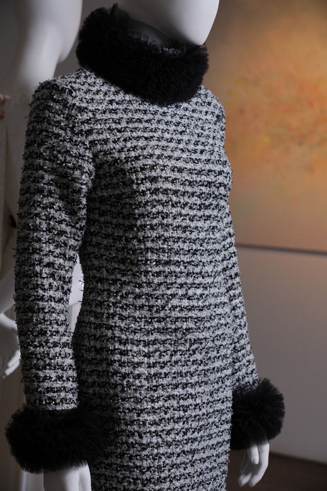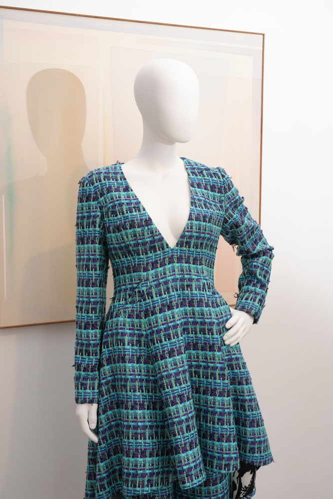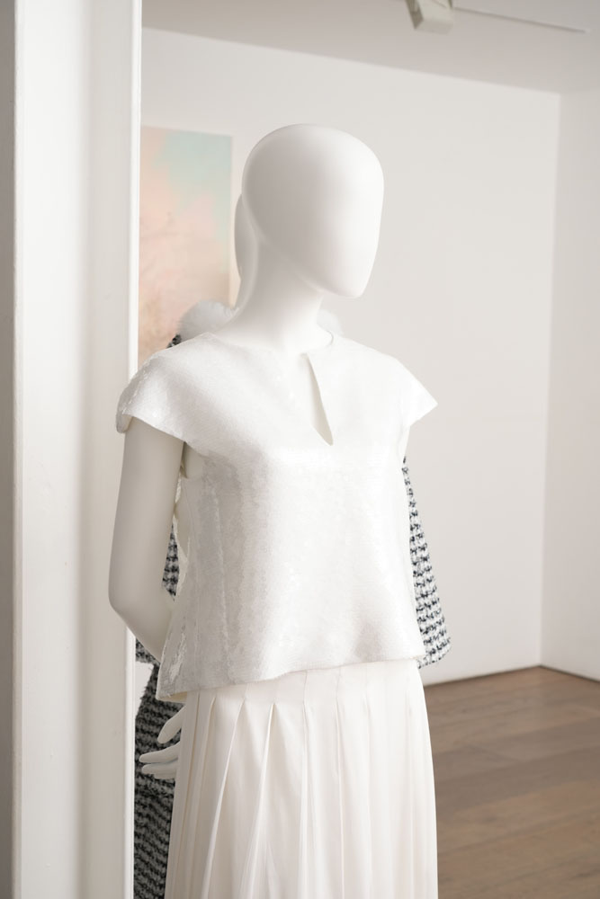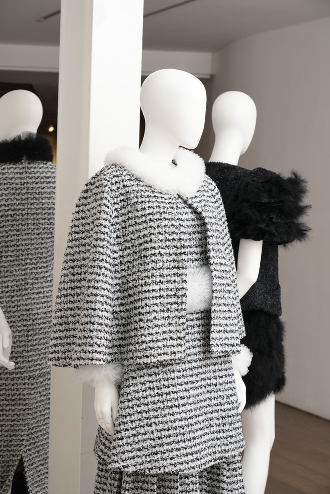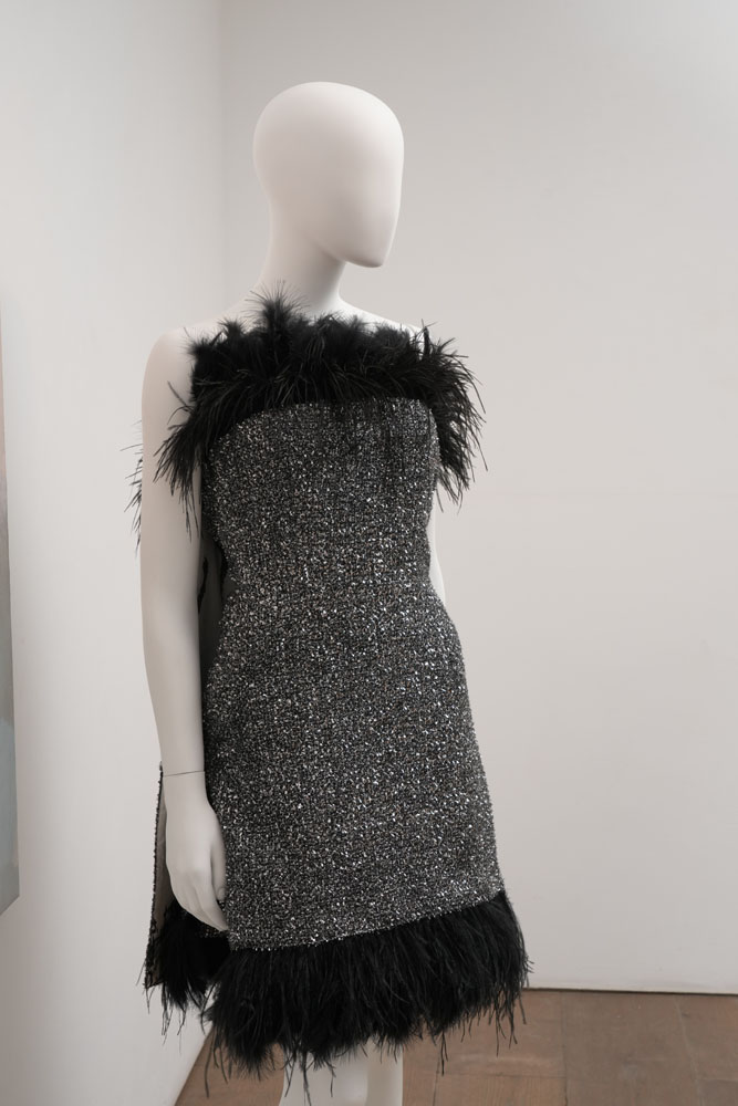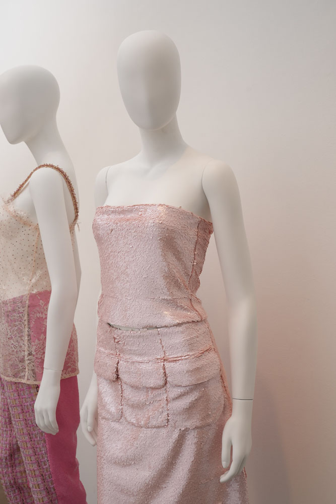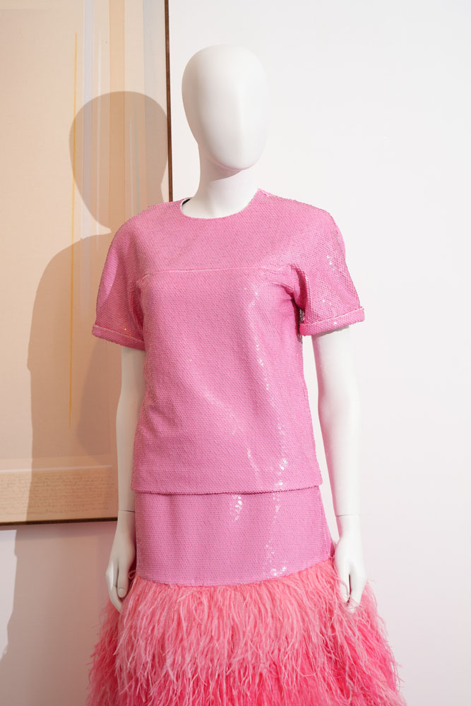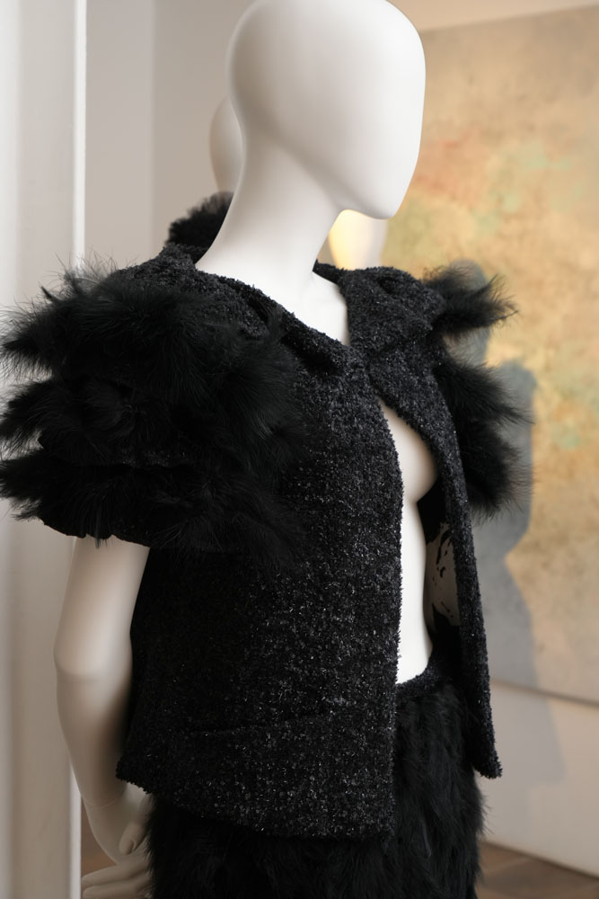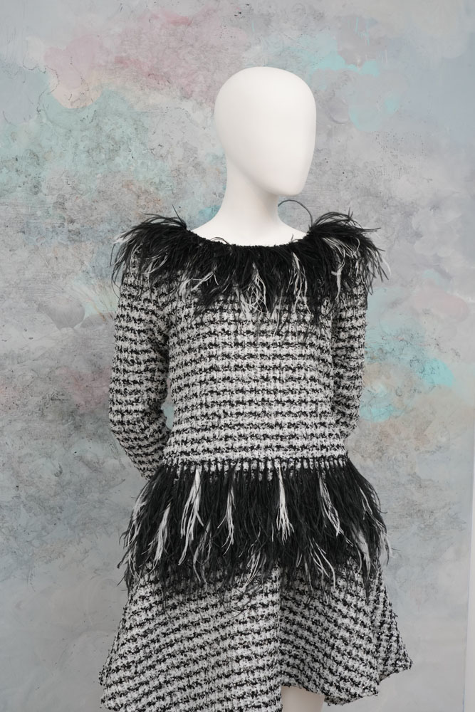 The collection’s shifting palette from bright pinks to more contemplative tones beautifully mirrors the joy and femininity of women in our modern era. Transitioning into deeper, introspective shades, the collection embraces refined tweeds, iridescent sequins, cascading feathers, and richer hues.