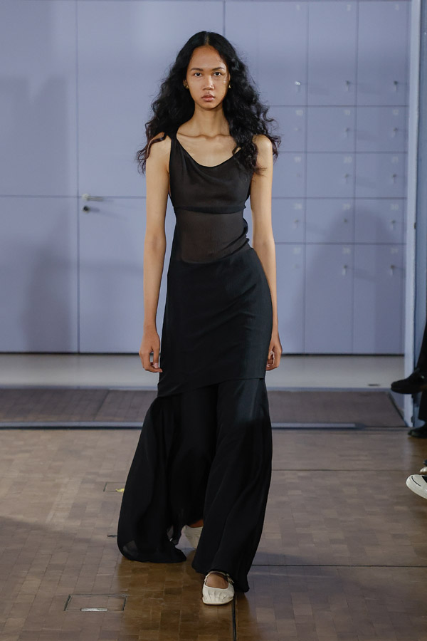 Fabric choices range from matte black and white jersey to hand-pleated metallic-like linen, and from stave-lined printed cotton silk to water-soluble cashmere, forming a rich symphony of textures. Deep brown and deep navy denim add depth and contrast, balancing the collection’s fluidity with robust structure. Together, these fabrics create a tactile melody, much like the layers of Terry Riley’s “In C,” which plays throughout the show.