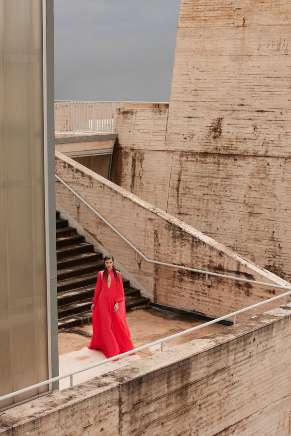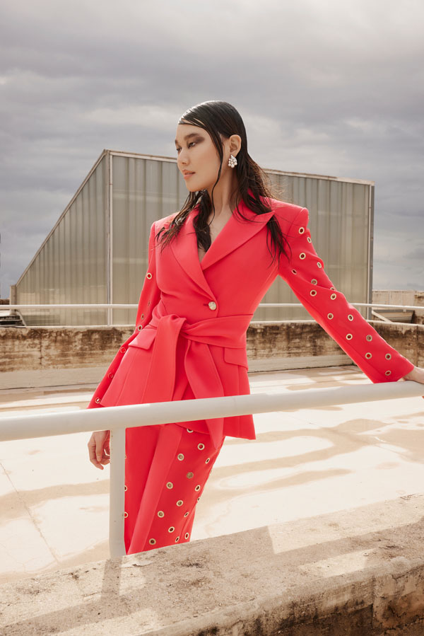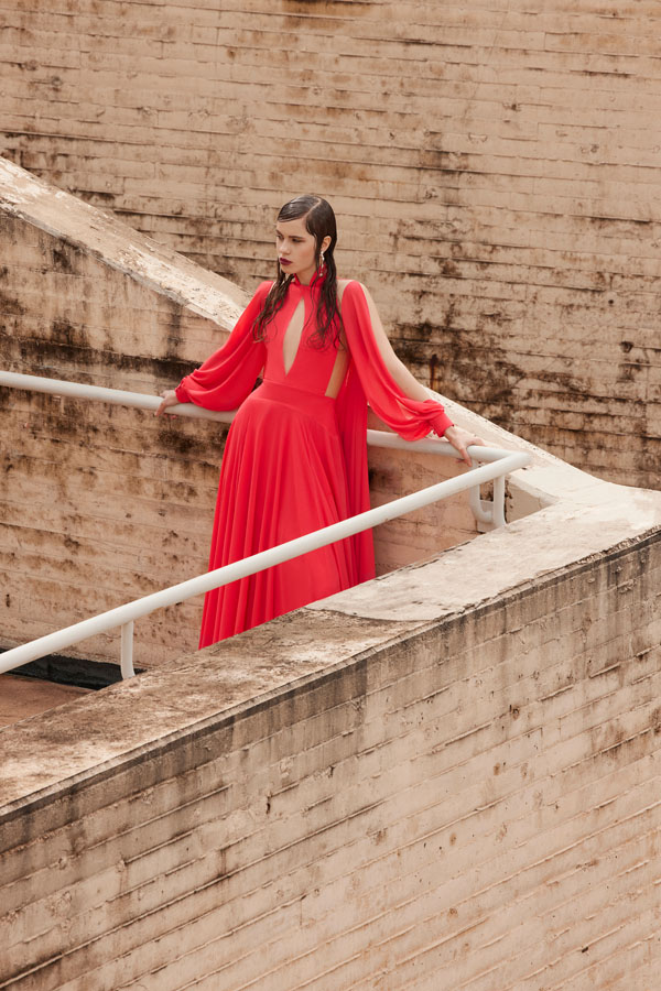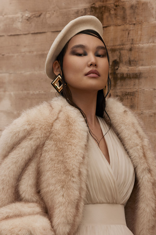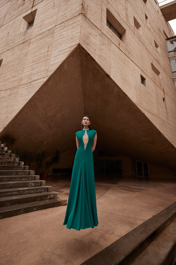 Divided into three distinct categories – Evening, Cocktail, and Daywear – the 60 look collection celebrates the exquisite balance of color and texture. A rich palette reminiscent of the season’s enchanting hues features shades of green, blue, burgundy, coral, black, and off-white. This symphony of color is further accentuated by a diverse selection of fabrics, including crepe, velvet, crepe georgette, organza, taffeta, lace, and fur. Each garment boasts depth and dimension, creating a captivating textural experience that embodies elegance.