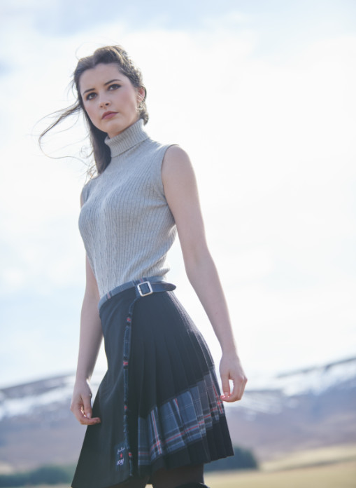 The unisexCaorunn kilt is formed of a staple black skirt replete with a swoosh of grey Caorunn tartan running through back pleats, finished with a touch of tartan on the waistband and fringe. ‘It can be taken from day to night in a heartbeat,’ says Mackenzie. ‘The daytime look may be teamed with a cashmere sweater, long riding boots and tights; for the evening, it can be paired with black heels and blouse.’ The menswear kilt, meanwhile, may be worn formally with black or grey Argyll kilt jacket and waistcoat, with black kilt socks and shoes, or casually with boots and a polo shirt or sweater.
