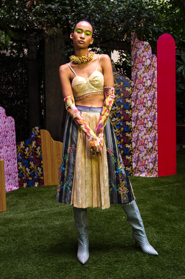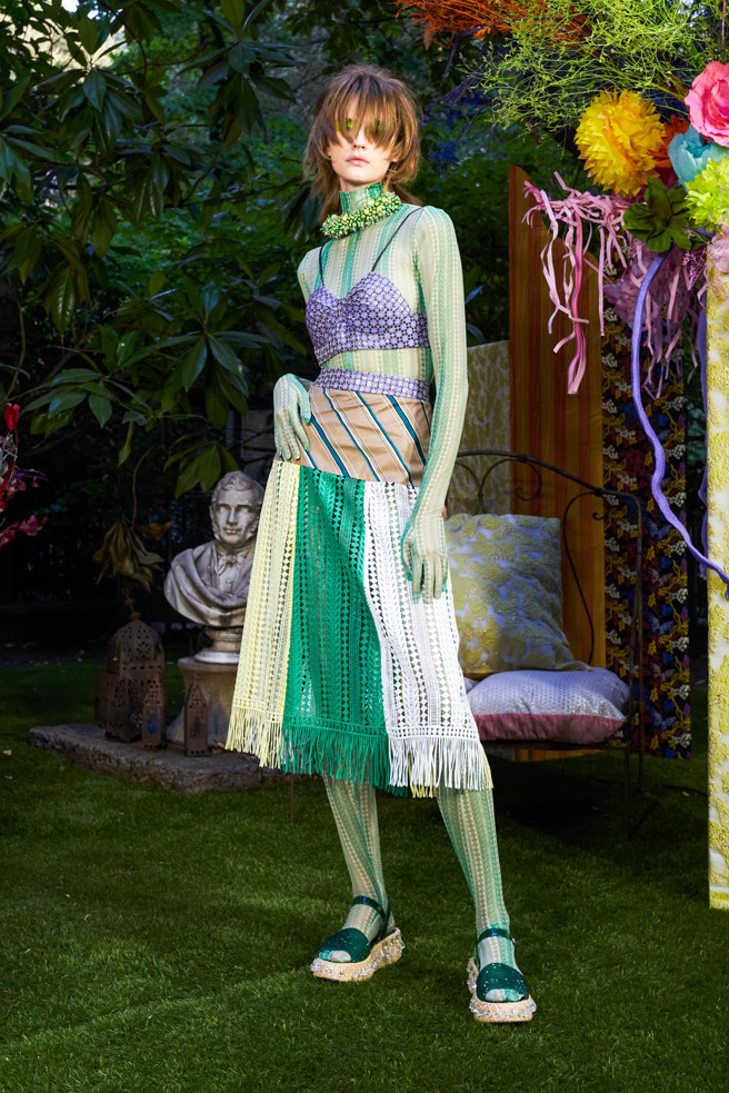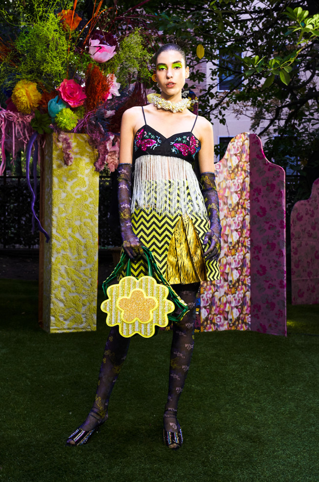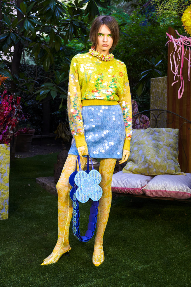 Frize views painting as a search for an agreement between “nature”, a viewer and a flat surface. Shuting mimics that viewpoint in her collection; her technical exercises capture the attention while she introduces nature with the frame of a dreamy spring garden. The collection, in a color palette of light green, light blue and pinks, expands on the designer’s signature tailoring to incorporate sportwear and swimwear. The designer collaborated with Swarovski in reusing leftovers crystals and stones to create flower and butterfly shaped bright sequin embroideries and embellish garments and accessories such as a new playful flower shaped bags with colorful beads. In a new take on her ongoing collaboration with UGGS, the classic boot is now wedged with an ombre sole, decorated with gradient-dyed faux fur, and embellished with artisanally crafted floral beads (inspired by her hometown of Hangzhou).