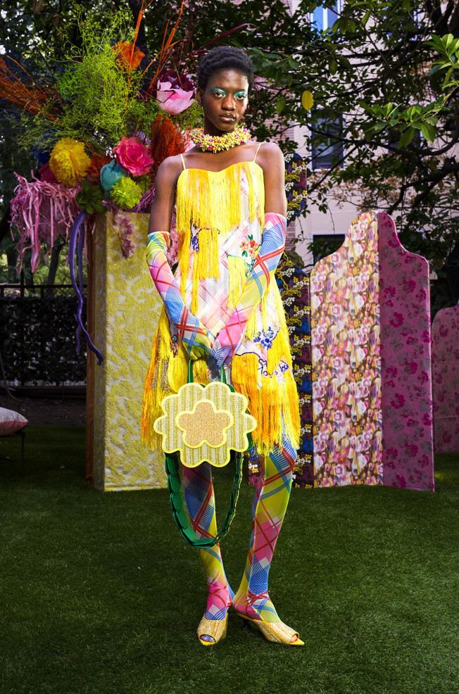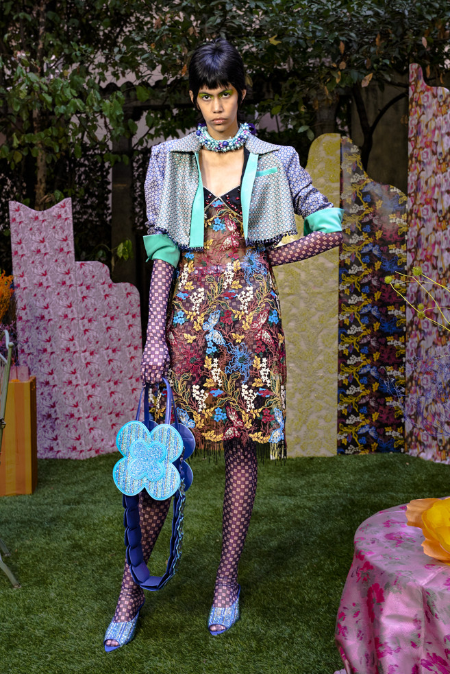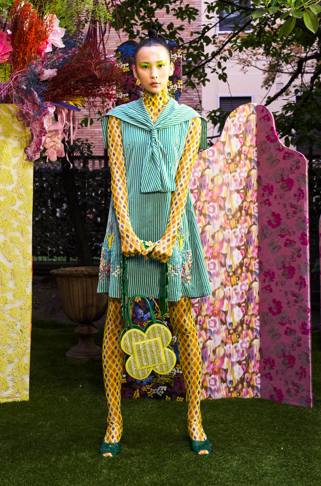 Frize views painting as a search for an agreement between “nature”, a viewer and a flat surface. Shuting mimics that viewpoint in her collection; her technical exercises capture the attention while she introduces nature with the frame of a dreamy spring garden. The collection, in a color palette of light green, light blue and pinks, expands on the designer’s signature tailoring to incorporate sportwear and swimwear. The designer collaborated with Swarovski in reusing leftovers crystals and stones to create flower and butterfly shaped bright sequin embroideries and embellish garments and accessories such as a new playful flower shaped bags with colorful beads. In a new take on her ongoing collaboration with UGGS, the classic boot is now wedged with an ombre sole, decorated with gradient-dyed faux fur, and embellished with artisanally crafted floral beads (inspired by her hometown of Hangzhou).