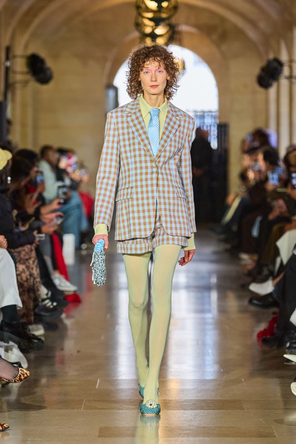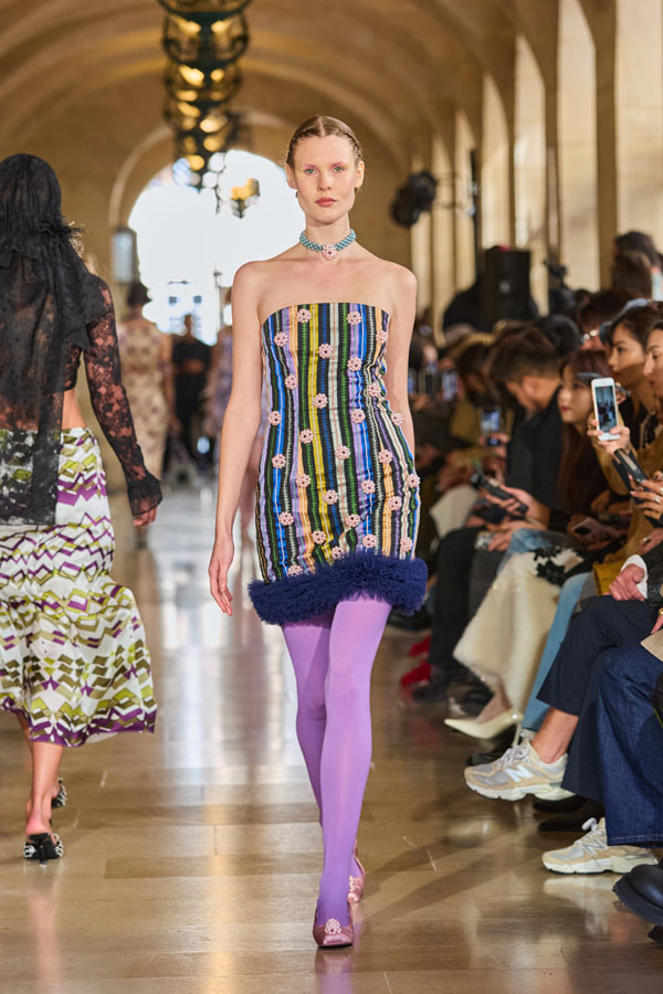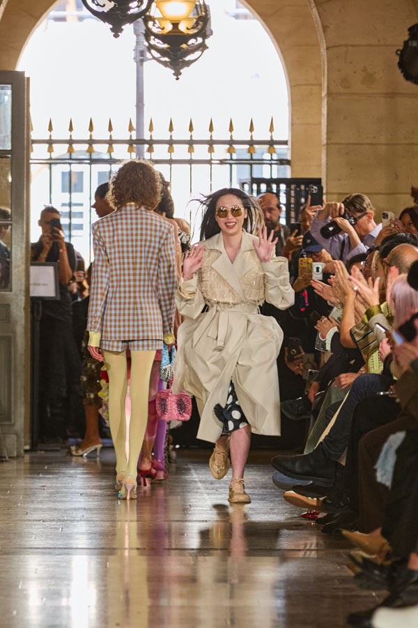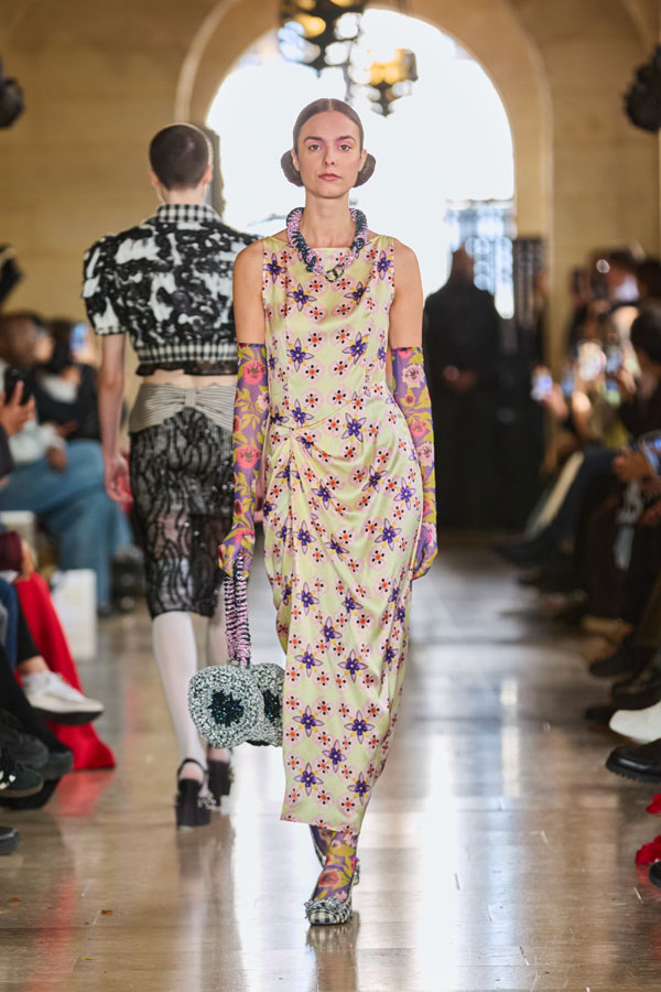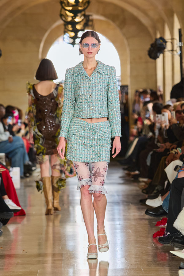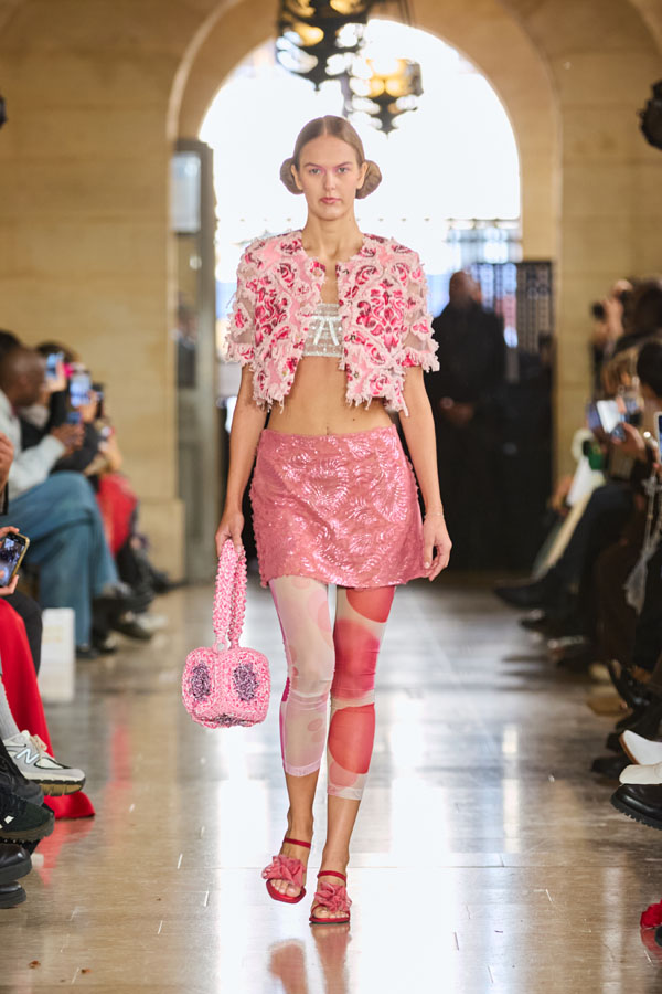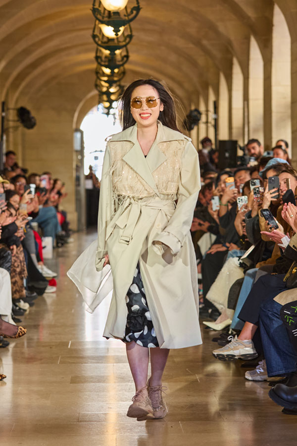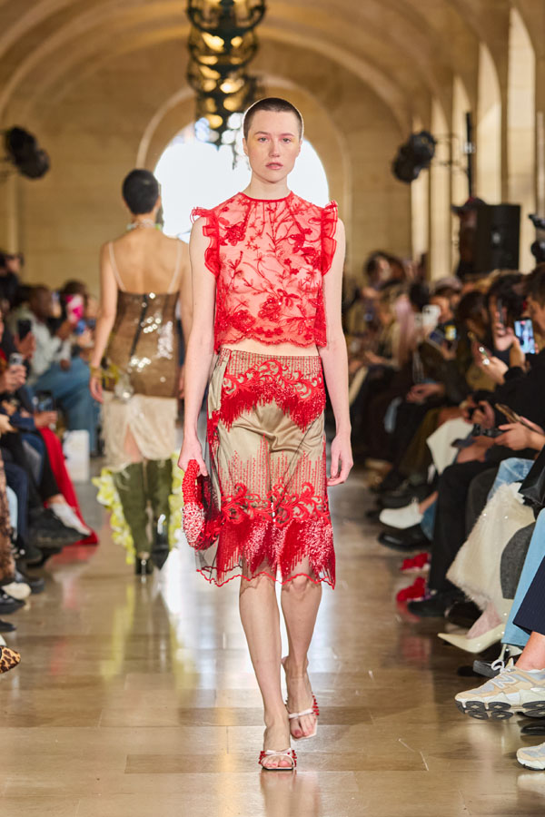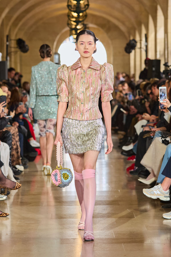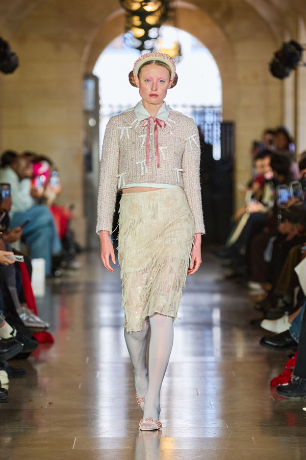 The collection begins as a dreamlike journey, a drift of thought that carries the designer from the pulse of the modern city into the luminous reverie of the Tang dynasty. Amid silken hues of rouge and glazed gold, she discovers a palette alive with memory: radiant reds, liquid golds, and a tender shade of wisteria drawn from her childhood sketches. Threaded through this brilliance is a black and white tone, evoking shadow and depth, transforming sweetness into strength. Each color becomes a bridge between innocence and sophistication, translating nostalgia into a language of maturity.