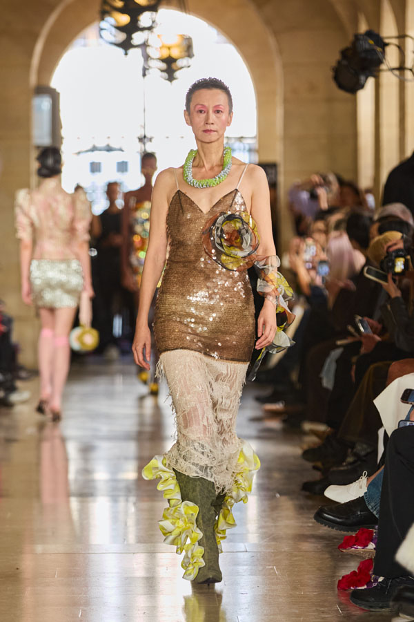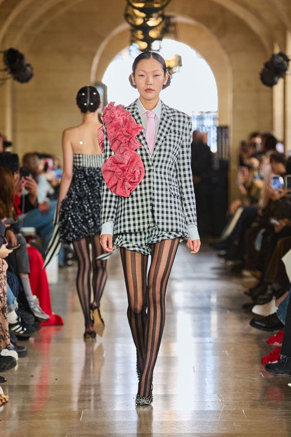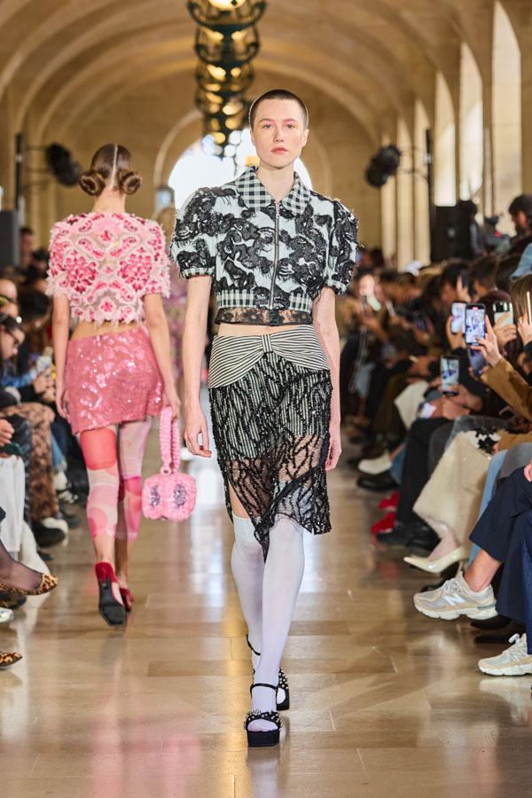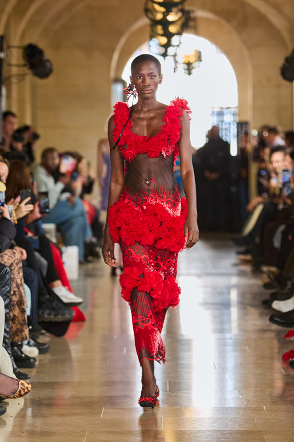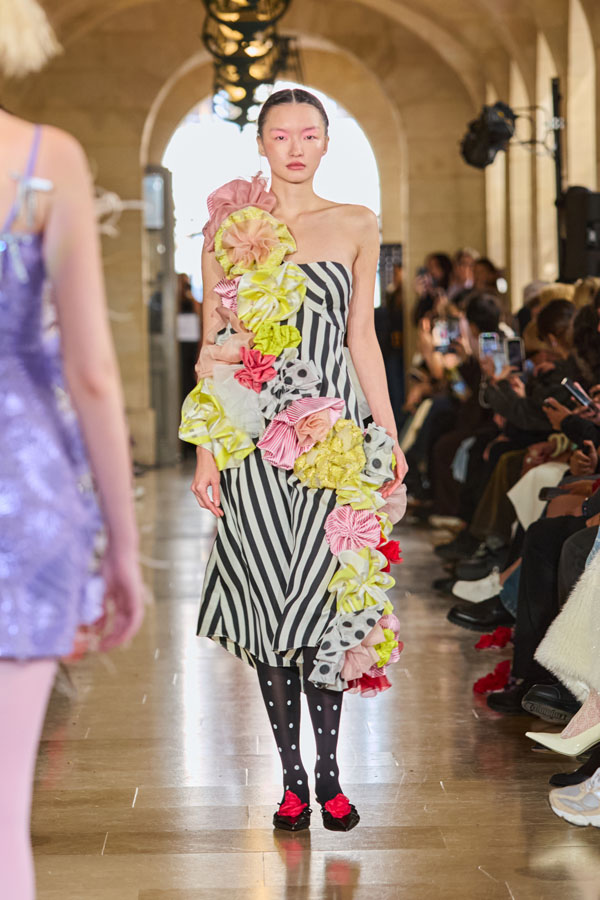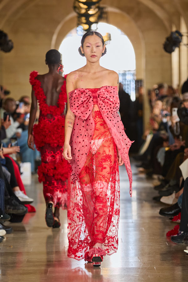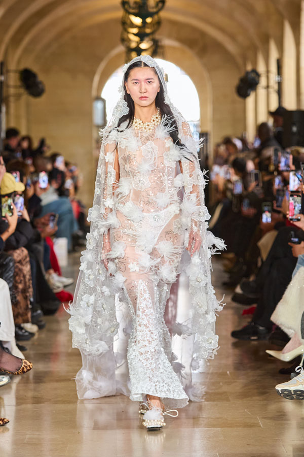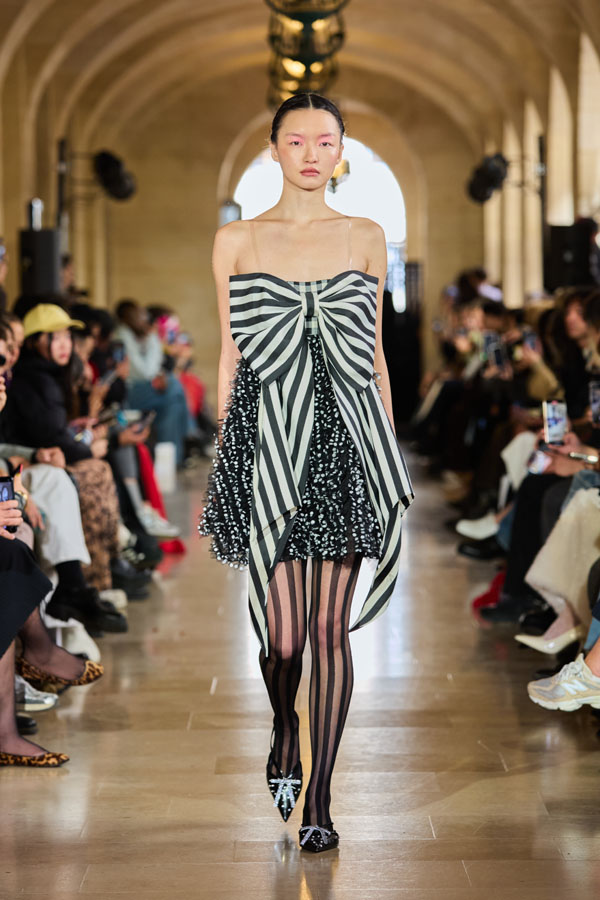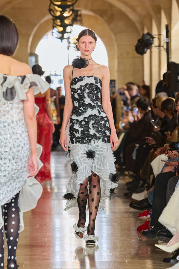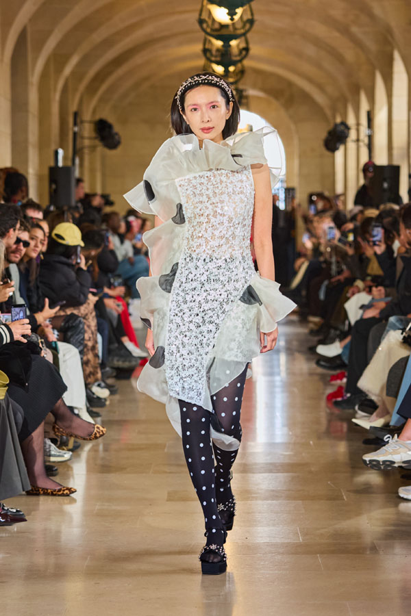 Throughout the collection, bows unfurl, florals bloom in sculpted relief, and ruffles ripple with dramatic grace, and sheer black and white weaves tension with romance. Once symbols of girlhood, these details now embody independence and conviction, each bow a quiet coronation, each flower a testament to resilience. The interplay of transparency and darkness reveals a new kind of softness, one that whispers rather than declares, yet holds undeniable power. SHUTING QIU redefines romance as courage, transforming delicacy into armor for the modern woman.