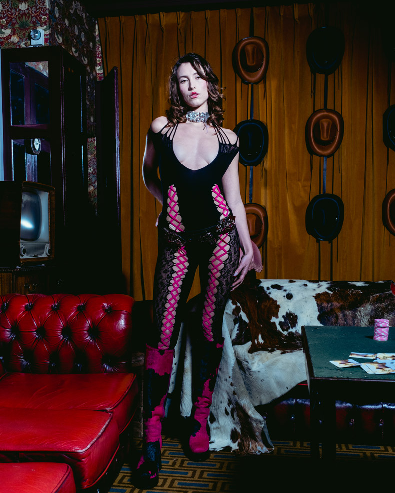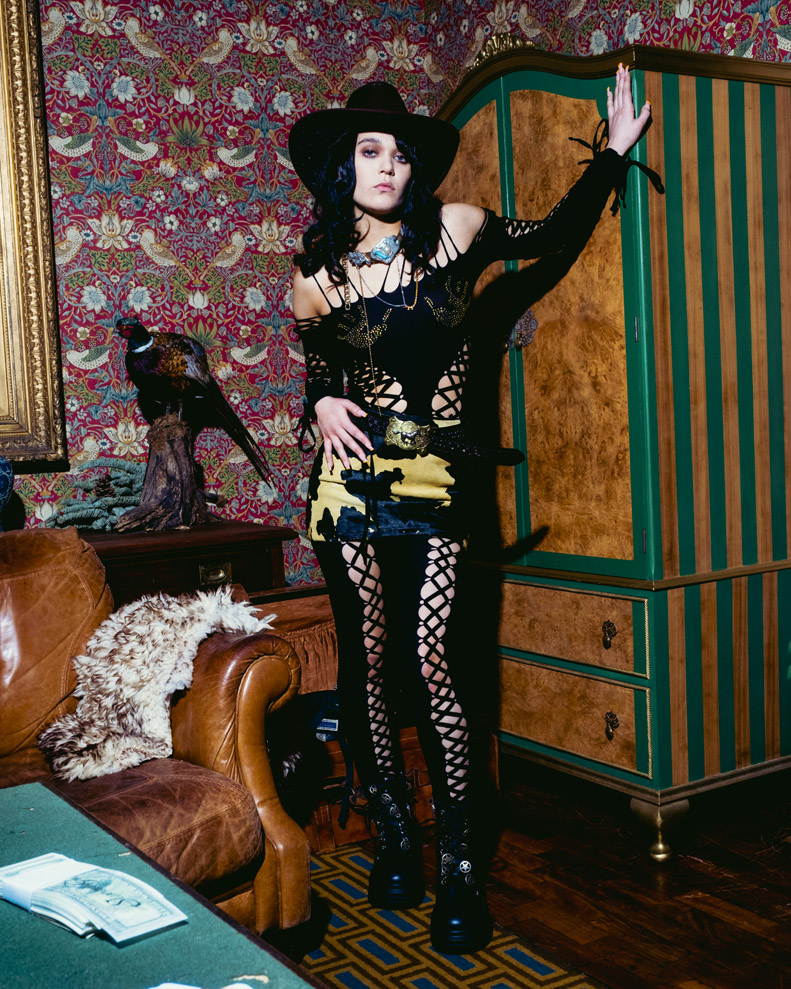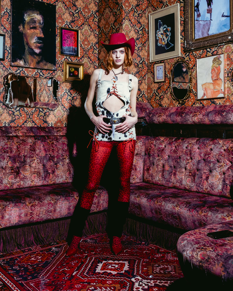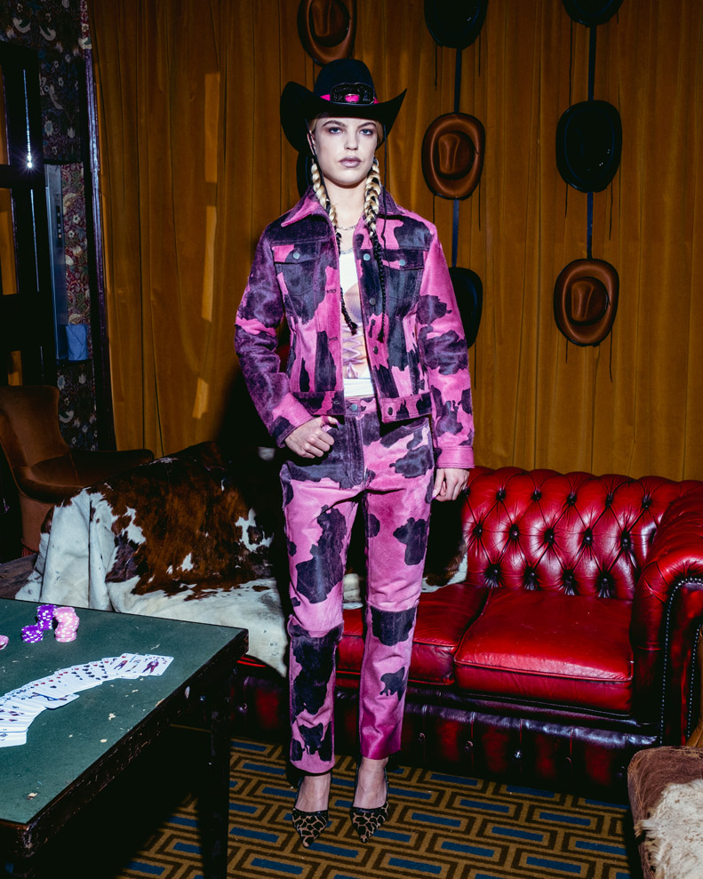 Sinead presents her viral signature curve enhancing styles, this season reimagined through the lens of a western shoot-out. Holes are shot through via laser cutting techniques, designed to swell around the bust and shrink at waist height. Styled alongside Trompe l’oeil looks, which play with the aesthetic canon of the ideal female body.