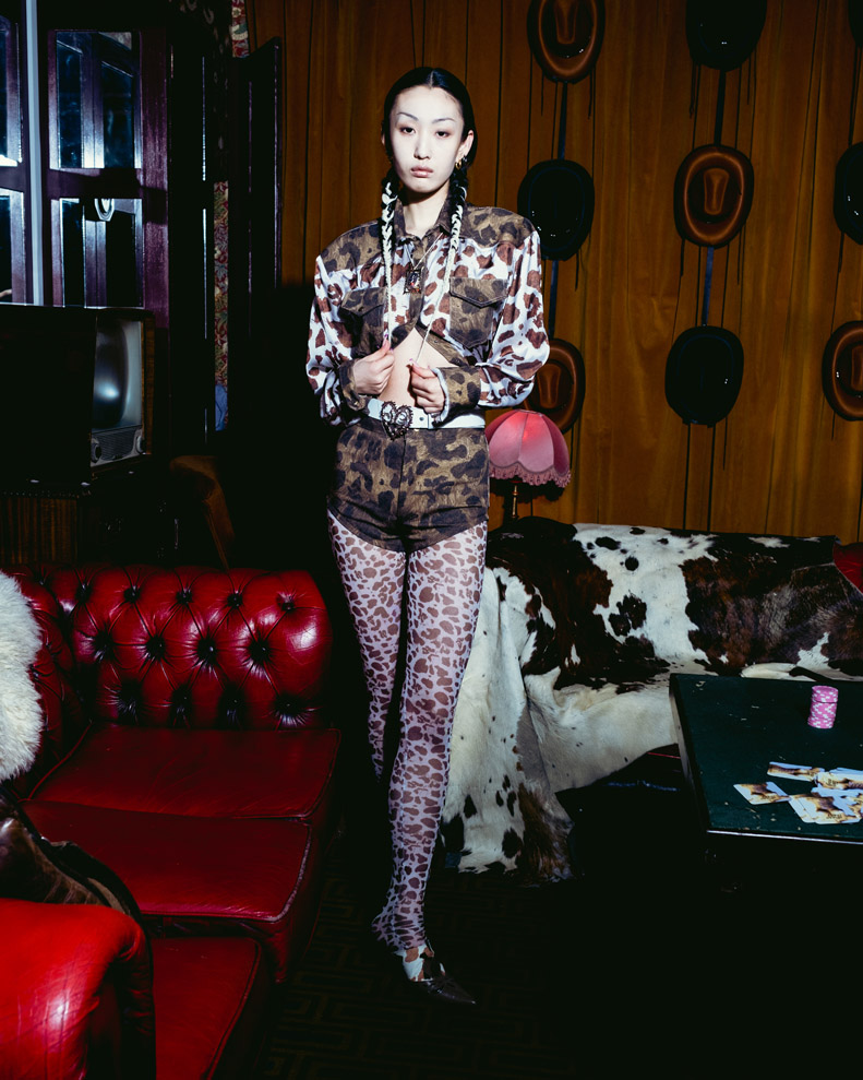 Reimagining functional garments, elevated by the use of luxury fabrications and innovative pattern cutting techniques. Cow-hide’s are bleached and dyed with vivid colours, made into dresses and belt-skirts finished with chunky metal zips. Lycra digitally printed with ribbon corset piercings, metal eyelet cord-up leather trousers, seamless shapewear knits with lasercut hand-beaded fringe. Cut-out dresses which are held together by elasticated cord, alongside rhinestone covered bodysuits.