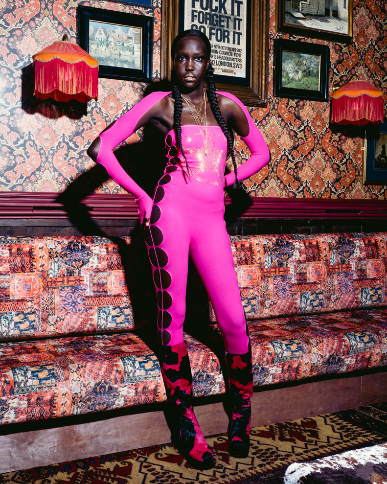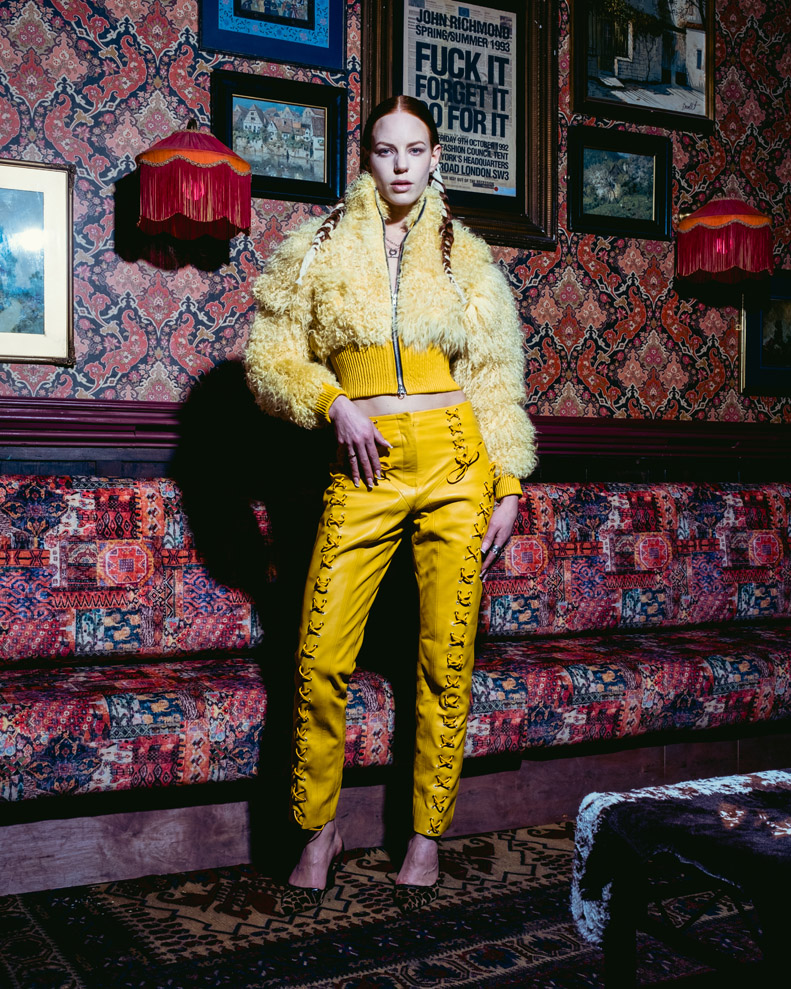 This season Sinead releases a signature own branded boot, alongside her partnership with long term collaborator Kickers. This seasons partnership with Kickers includes the brands new silhouette release for 2023, the Kade. Original Kades are styled alongside a number of custom pairs within the looks, celebrating a new icon from the Kickers brand.