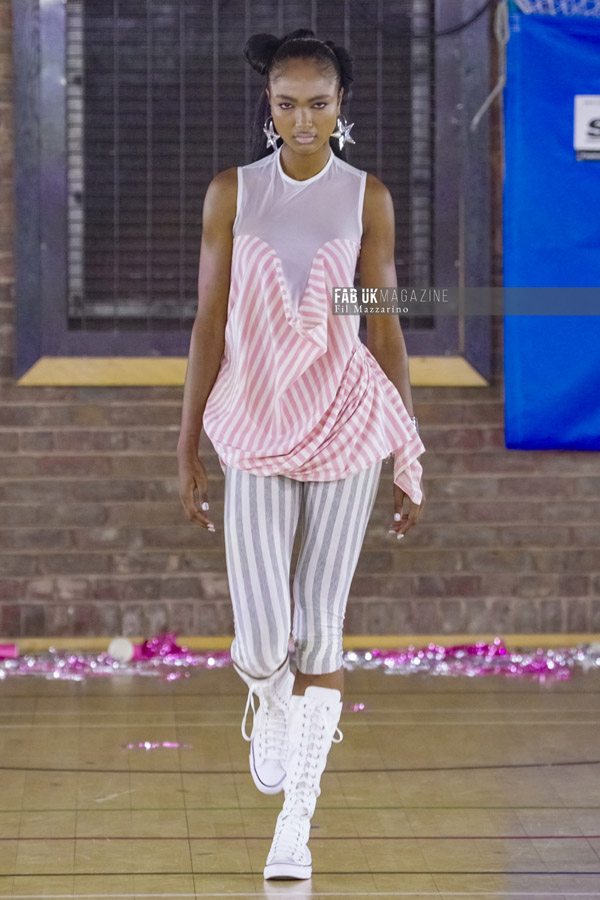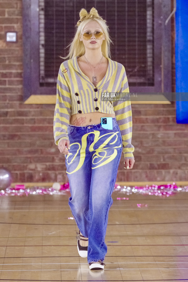 Naturally, the protocol for more formal dress is entirely eschewed. UV-reactive leatherette sets, exposed fly skater jeans – splashed with an Love SG’ barbel piercing overlay – or nostalgic military micro skirts and admiral jackets become the uniform for this high school graduate, free to roam into the night.
