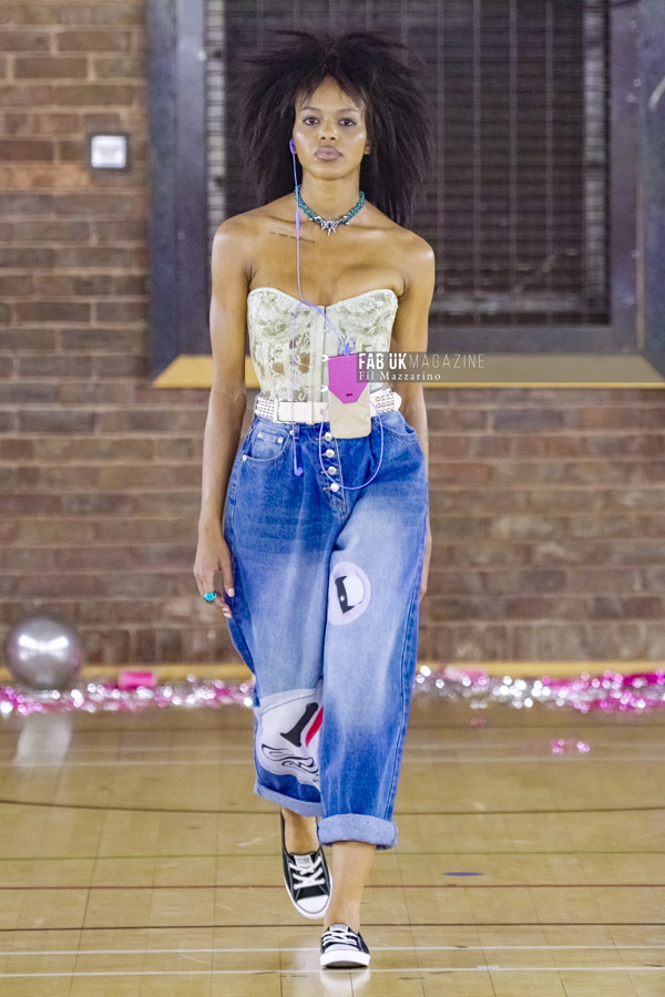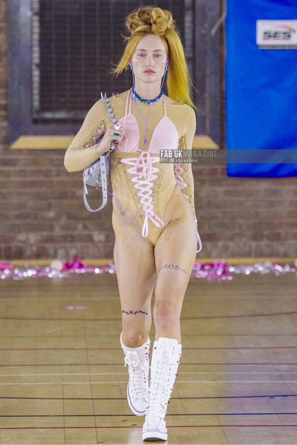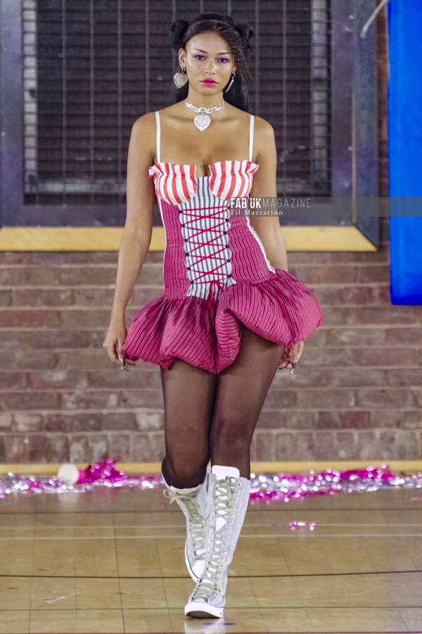 “Prom is that time in your life when you’re finally finding your style, so I wanted to recreate that using luxury shapes and constructions,” says Gorey. Working closely with corsetry, evening wear and the broader :odes of her youth – school uniform, aerodynamic rave gear and denims – the South Londoner makes way fa new fabric innovations while updating the classics for this season’s antagonist. “She’s the outcast of the prom, ditching the archetypal prom dress. In fact, she’s probably not even going to prom – just the afterparty,” adds Gorey.