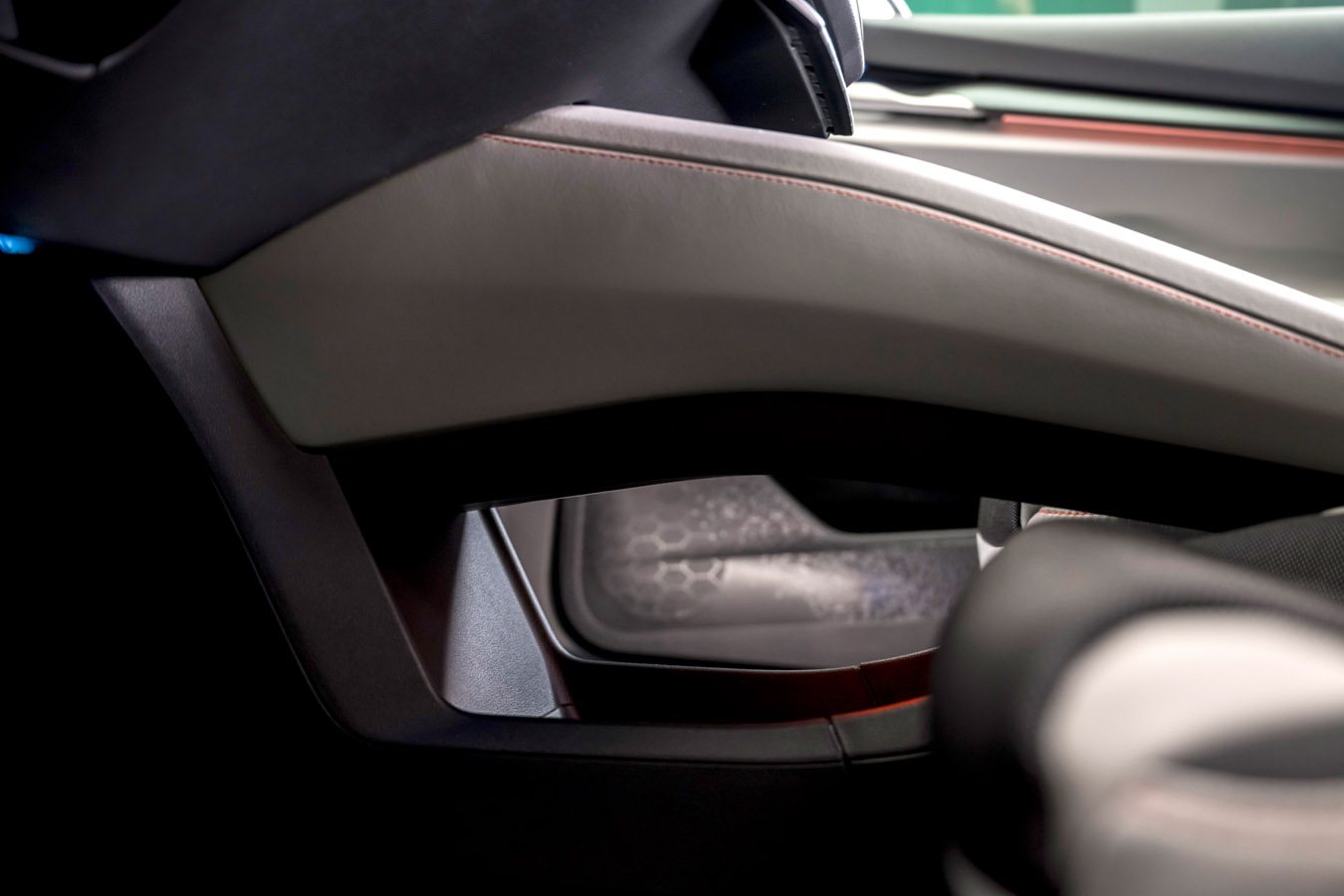 The optional Lodge Design Selection features a material called Technofil, which is composed of 75% recycled ECONYL® fibres and 25% polyester. The innovative ECONYL® yarns re-use nylon waste, such as fishing nets, fabric scraps and carpets destined for landfill, transforming them into new nylon yarn. Known for its excellent friction and abrasion resistance, ECONYL® nylon is also 100% regenerable, allowing yarns to be recycled repeatedly without ever losing quality. The Lodge Design Selection combines black Technofil fabrics with light grey artificial leather. There are also numerous orange-coloured accents, for example on the seat belts and in the contrasting stitching on the seats and upholstery. This combination is inspired by the Škoda Vision 7S concept car, focusing on the classic elegance of black leather and artificial leather with cognac-coloured contrasting stitching.