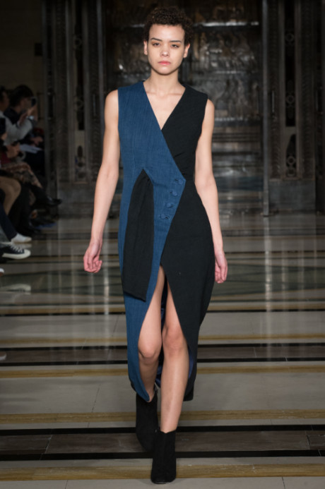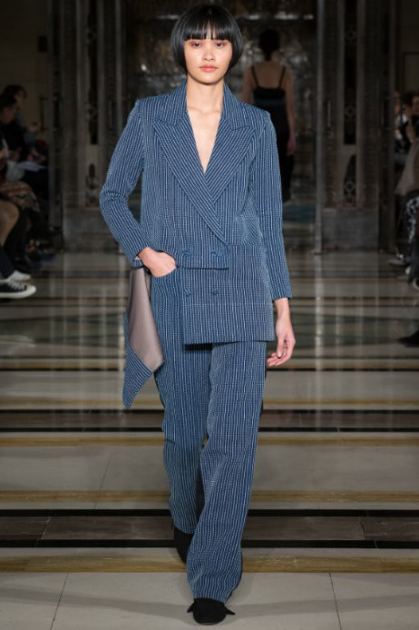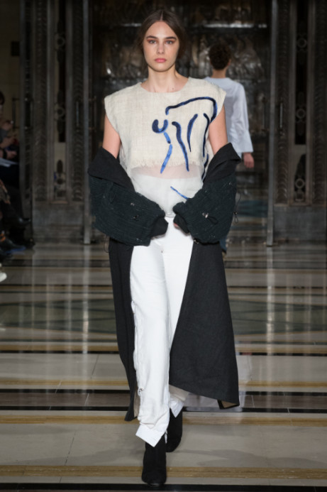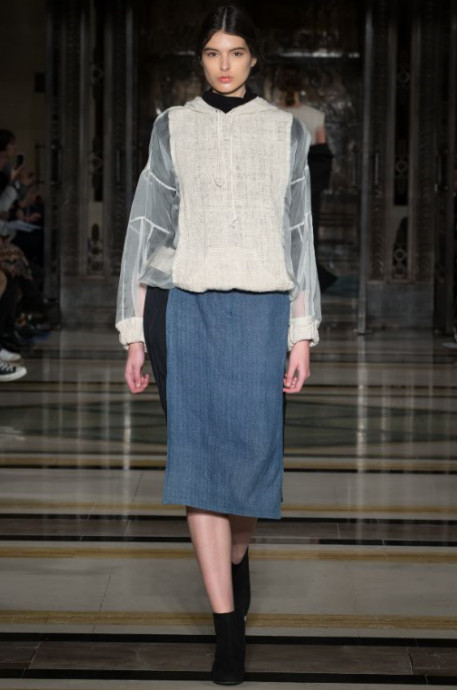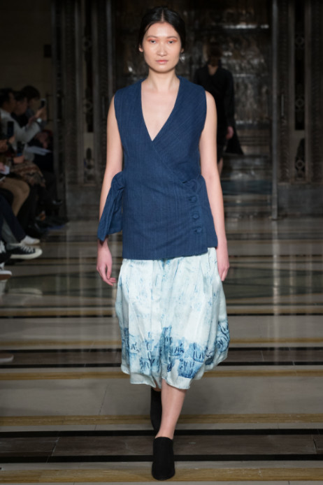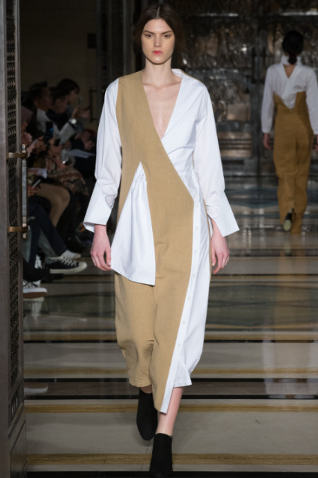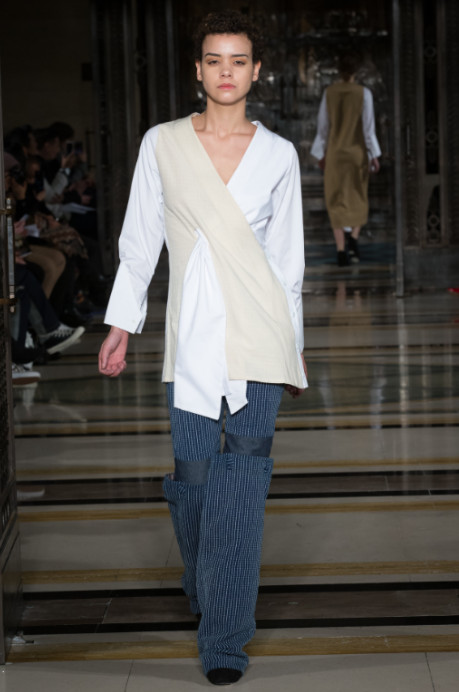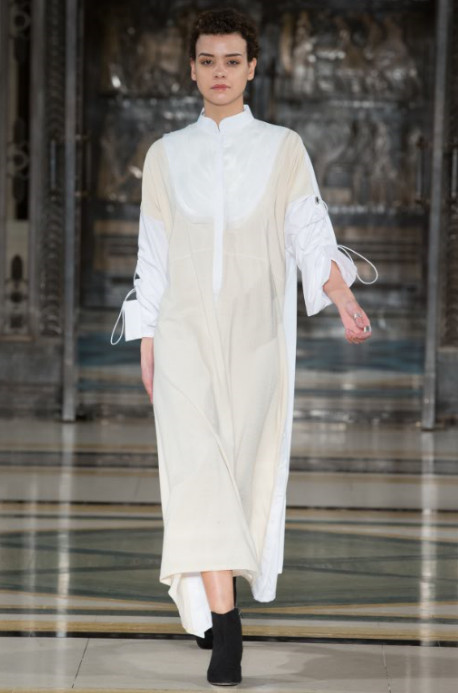 The look is androgynous, exploring masculine silhouettes; loose fit dresses, jackets, trousers, skirts and shirts in handwoven cotton, crisp poplin and silk organza are layered to create both fitted and oversized shapes. In contrast, feminine detailing is seen on cinched in waists and drawstring detailing.