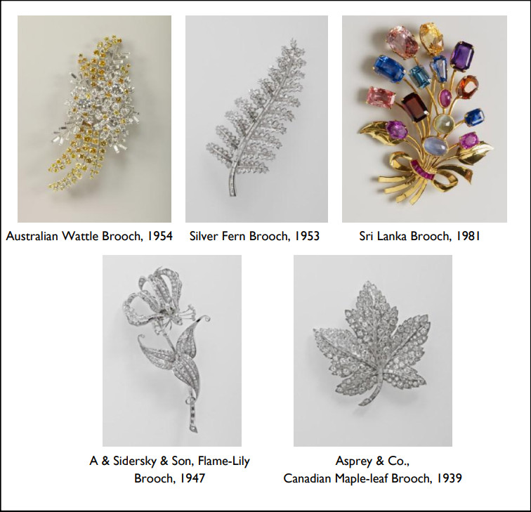 Also on display are brooches representing the emblems of some Commonwealth countries. These include the Canadian Maple-leaf Brooch, worn by Her Majesty (then Princess Elizabeth) on her first visit to Canada in 1951; the Flame-Lily Brooch, the emblem of Zimbabwe, which was pinned to The Queen’s mourning clothes when she returned to Britain from Kenya after the death of her father in 1952; the New Zealand Silver Fern Brooch, the Australian Wattle Brooch, and the Sri Lanka Brooch.