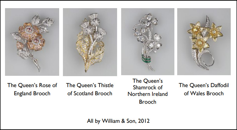 On display for the first time is a group of four brooches belonging to Her Majesty, each representing a nation of the United Kingdom, with a sprig of shamrock for Northern Ireland, sprays of daffodils for Wales, thistles for Scotland and roses for England. The brooches are made of gold, set with white, pink and yellow diamonds and, for the shamrock, emeralds. The Queen has worn these brooches on numerous occasions, often while visiting the nation represented by the emblem.