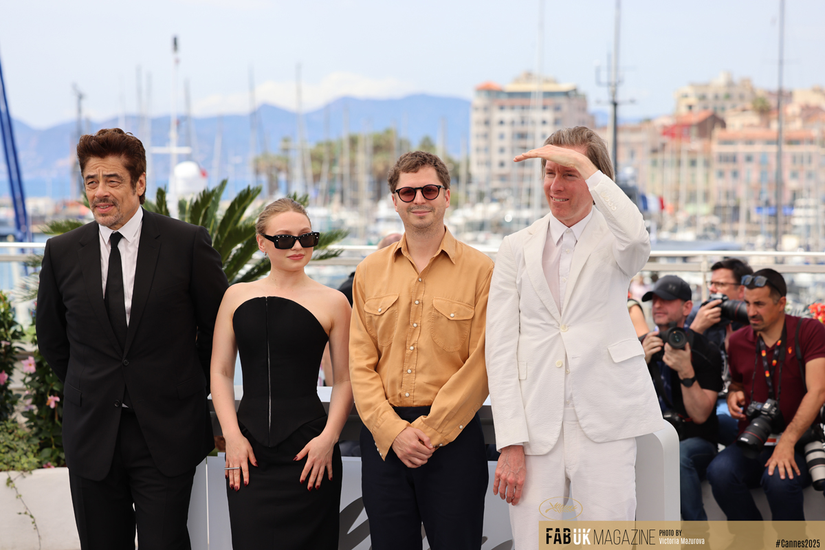 (LtoR) Benicio del Toro, Mia Threapleton, Michael Cera and Wes Anderson attend “The Phoenician Scheme” photocall at the 78th annual Cannes Film Festival at Palais des Festivals on May 19, 2025 in Cannes, France. (Photo by Victoria Mazurova/Fabuk)
