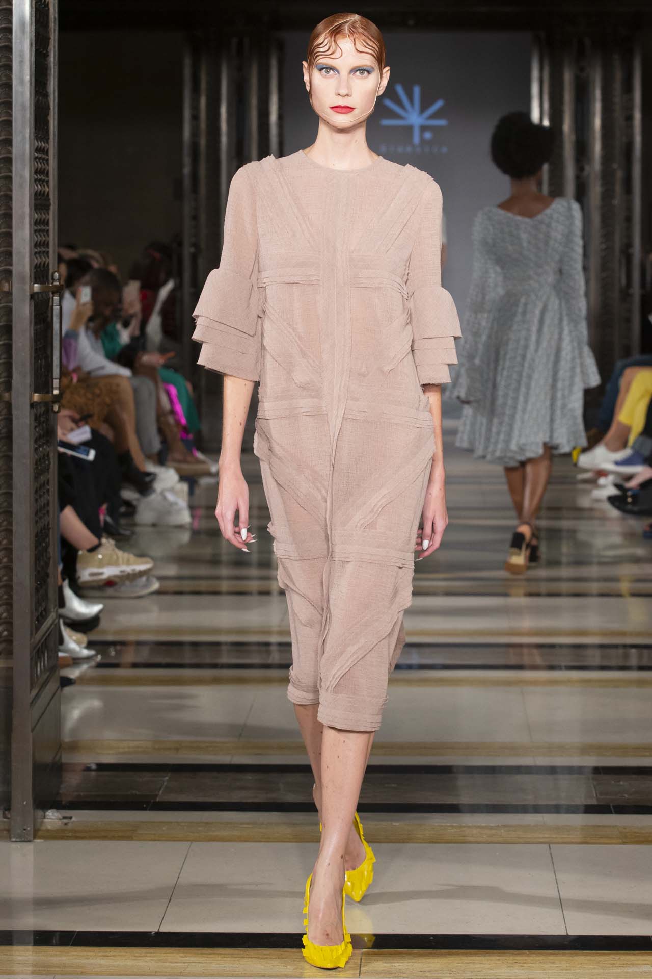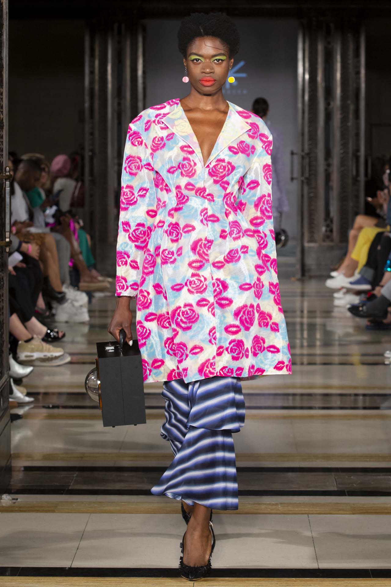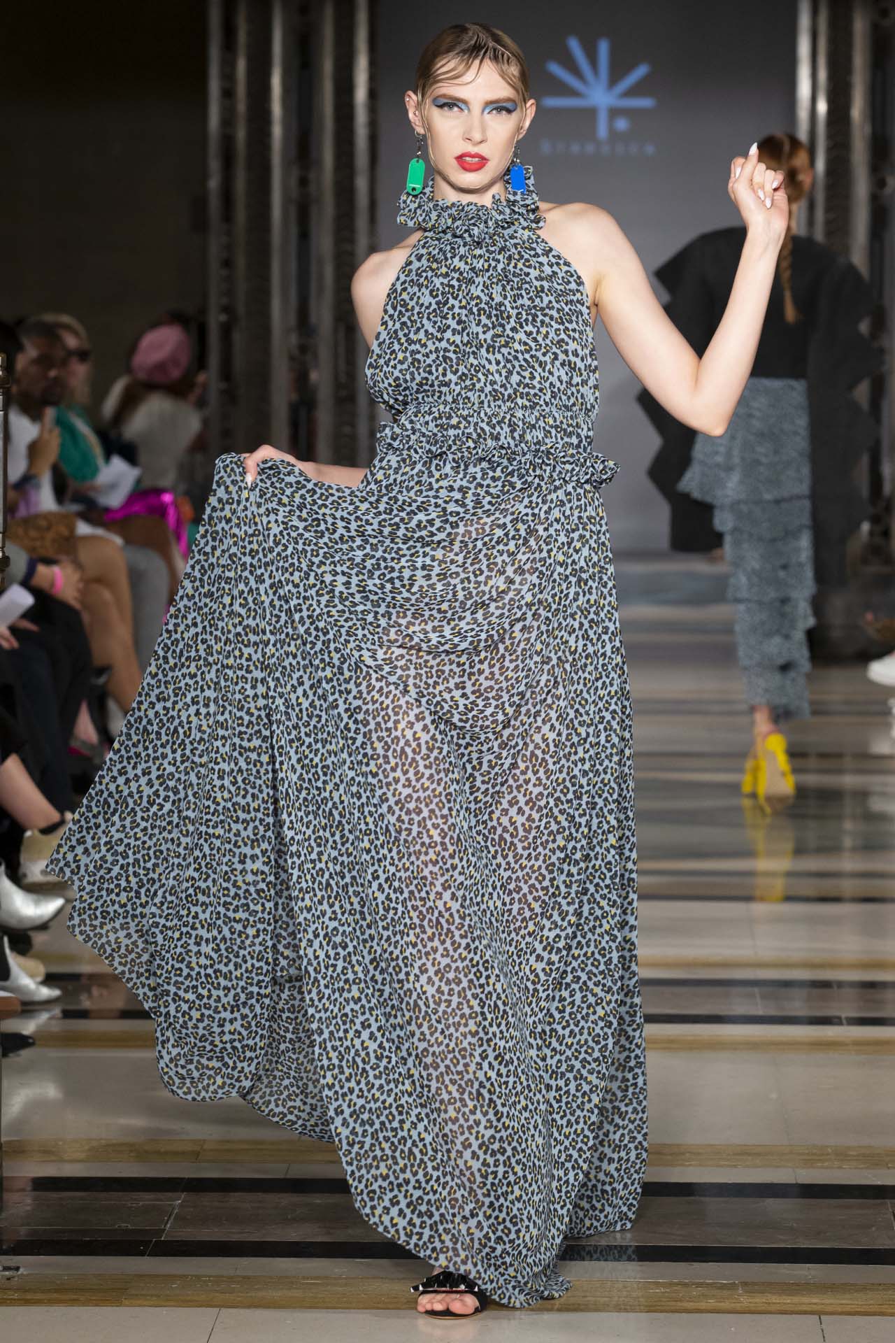 Key SS19 ‘separates’ and ‘dresses’ are divided into multiple layers reflecting the earth’s strata and showing the flow of time. The collection evokes a variety of associations such as Leopard print and chiffon reflecting morning dew on fossilised plants. Stickers on coats and dresses reflect memory fragments of exotic places visited. The rattan dress and jacket has zigzag detail edging as if cut by frenzied scissors. It takes inspiration both from memory fragments and the disconnection of the character’s surrealist journey into the past.