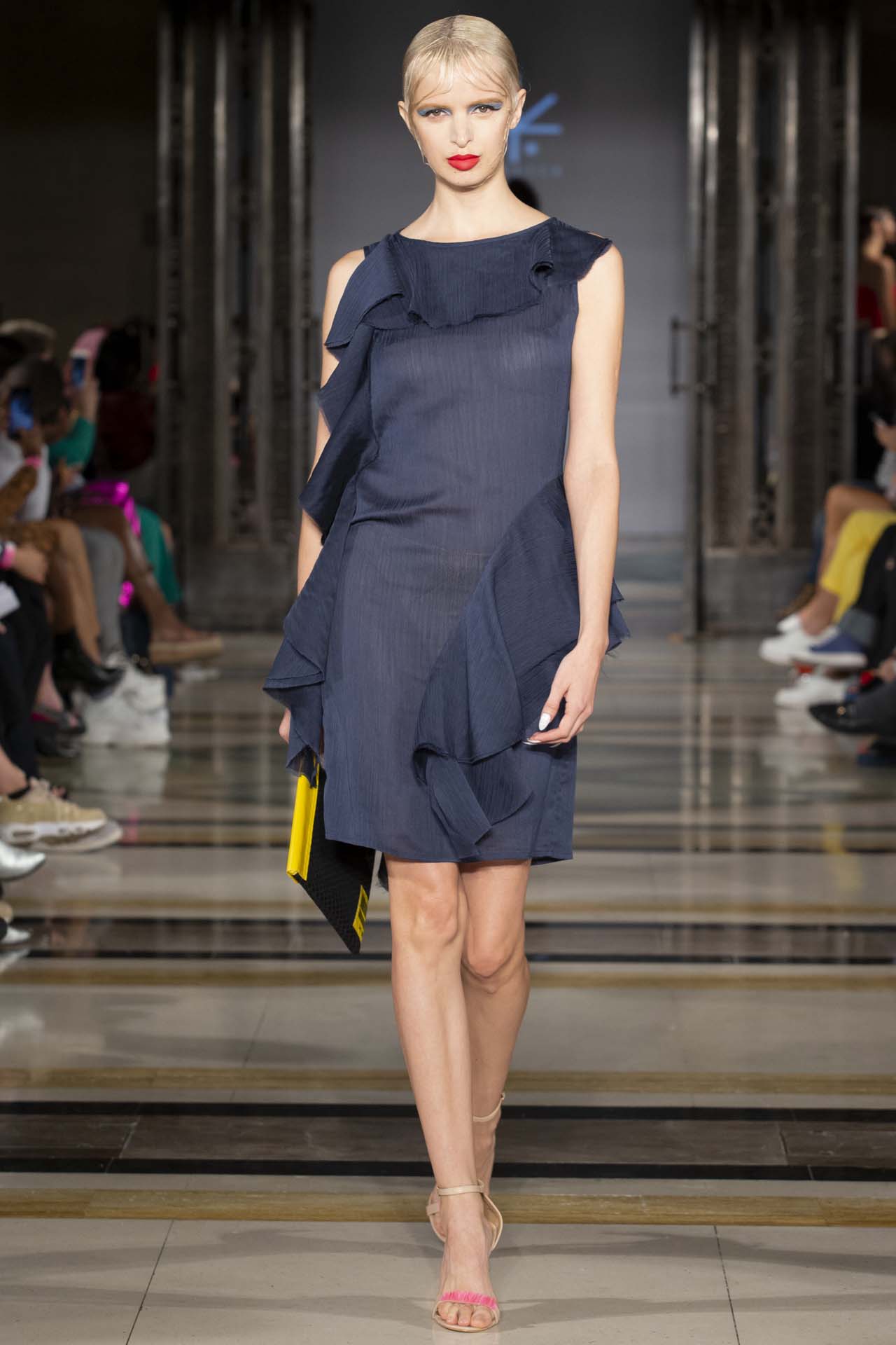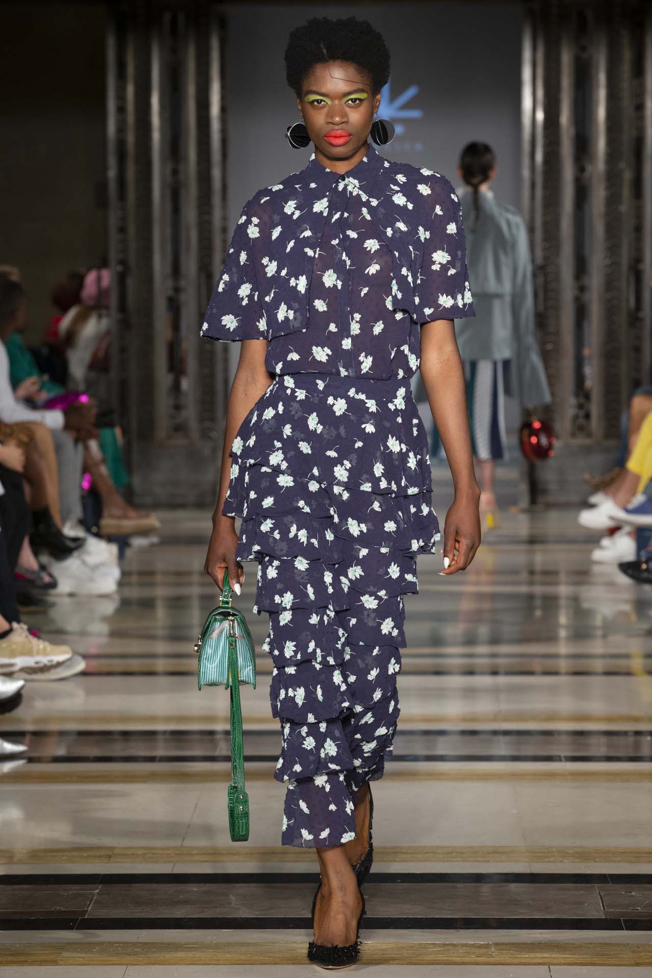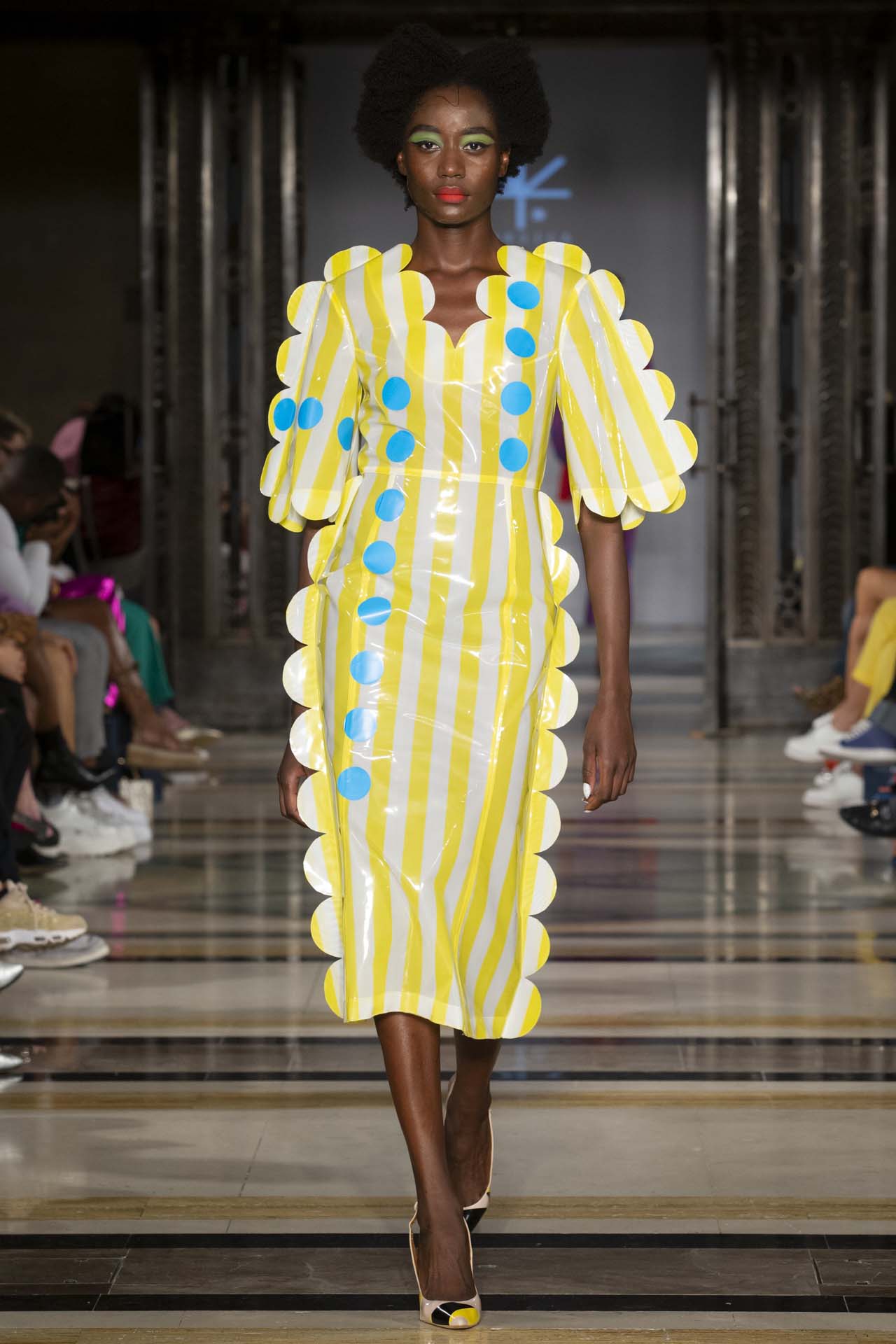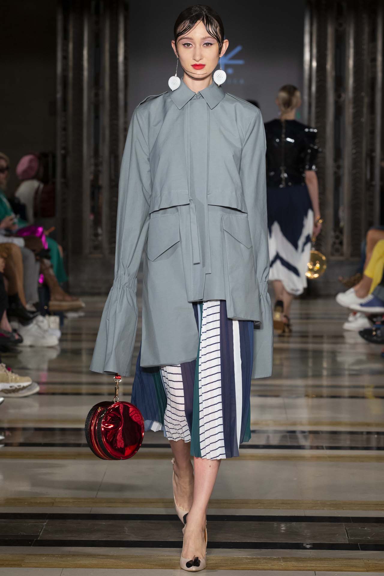 Key SS19 ‘separates’ and ‘dresses’ are divided into multiple layers reflecting the earth’s strata and showing the flow of time. The collection evokes a variety of associations such as Leopard print and chiffon reflecting morning dew on fossilised plants. Stickers on coats and dresses reflect memory fragments of exotic places visited. The rattan dress and jacket has zigzag detail edging as if cut by frenzied scissors. It takes inspiration both from memory fragments and the disconnection of the character’s surrealist journey into the past.