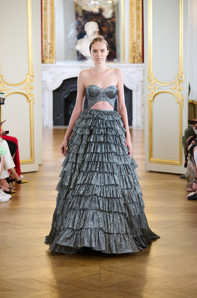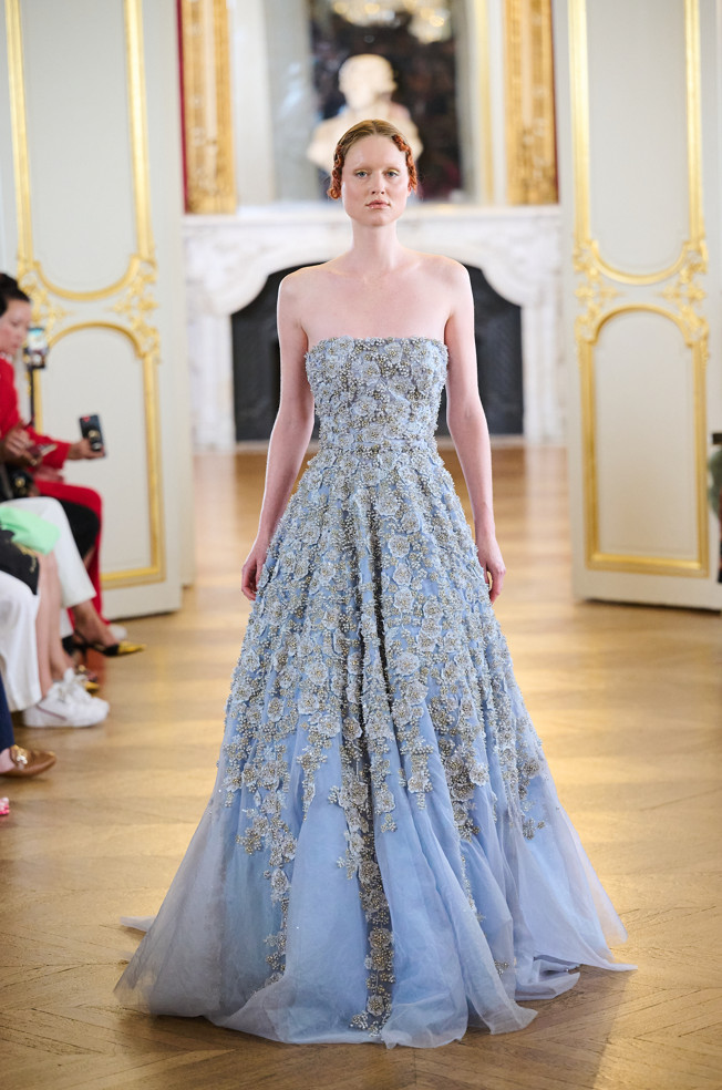 The cuts are mostly corseted dresses, full-length ball gowns, ruffles, feathers, embroidery with floral and nature-inspired details, and fitted fully embroidered dresses.